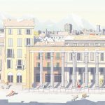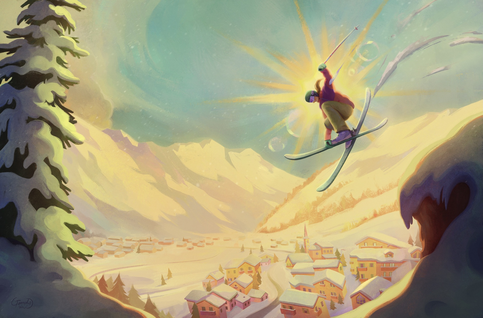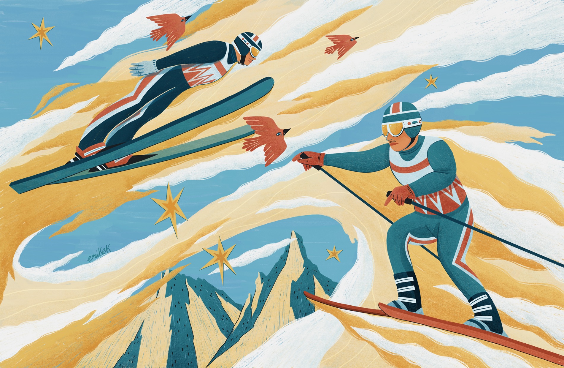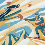 Le illustrazioni sono ambientate nel cuore dell’inverno, quando il mondo tace, il cielo respira neve e le montagne si svegliano come giganti addormentati. Sui loro fianchi candidi scorrono tracce sottili, disegnate da sciatori che sembrano pennelli intinti in un mare di gelo. Lo snowboarder danza con la pendenza, scivola come un pensiero libero, salta, gira, si sospende tra terra e cielo per un istante che sembra eterno. Come nella combinata nordica: prima il salto, un volo che sfida il silenzio, poi la corsa sugli sci, una lotta contro il tempo e contro se stessi. È l’arte del bilanciare l’audacia e la pazienza.