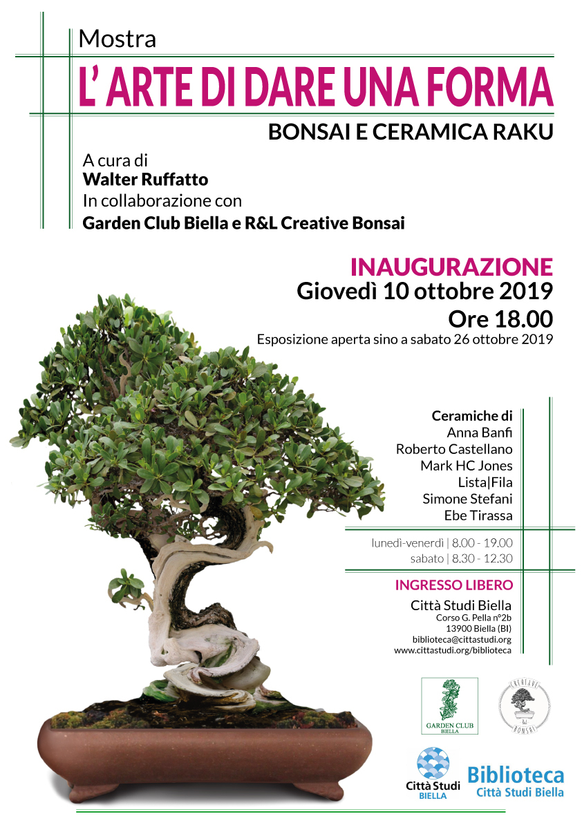 La mostra organizzata da Città Studi Biella, in collaborazione con Garden Club Biella e R&L Creative Bonsai, è una presentazione di bonsai e creazioni contemporanee di ceramiche Raku realizzate da sette esperti ceramisti.