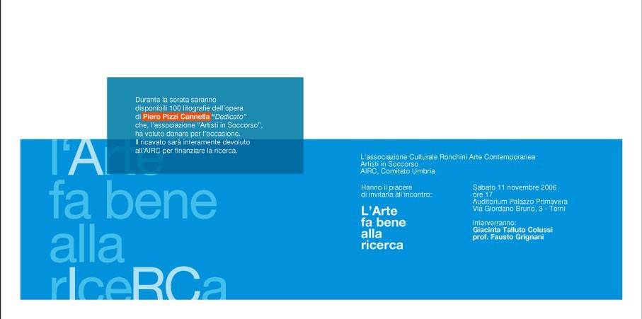 Sabato 11 novembre alle ore 17 presso l’Auditorium di Palazzo Primavera a Terni in Via Giordano Bruno 3 sarà infatti presentata un’opera litografica di Piero Pizzi Cannella “Dedicato” che lo stesso autore ha realizzato appositamente e donato in qualità di Presidente dell’Associazione ONLUS Artisti in Soccorso* ed il cui ricavato andrà interamente a favore della ricerca.