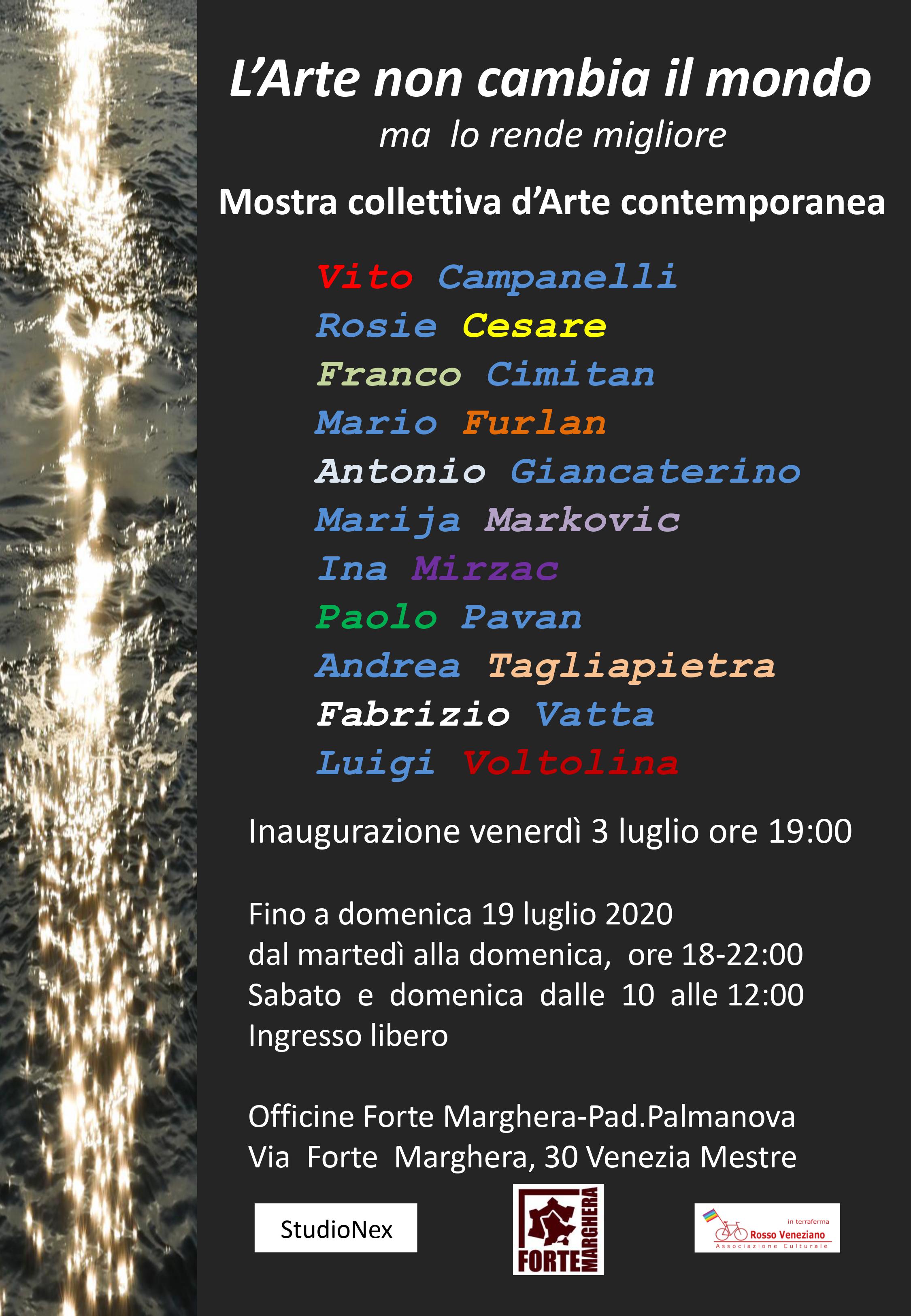 La mostra, dal titolo "L'Arte non cambia il mondo ma lo rende migliore" si svolgerà da venerdì 3 - inaugurazione alle 19:00 - a domenica 19 luglio con apertura dal martedì alla domenica ore 18 – 22:00 ed il sabato e la domenica anche dalle 10 alle 12:00.