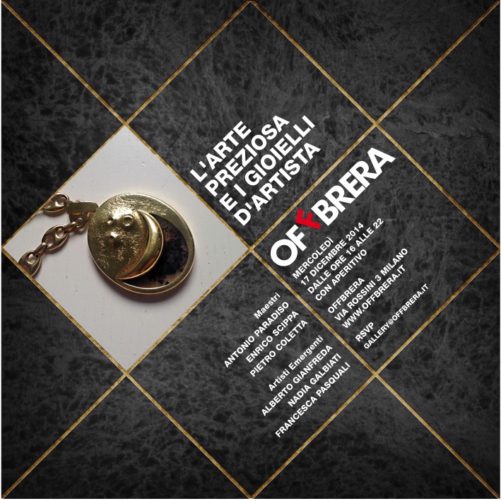 Offbrera è Lieta di invitarVi ad una speciale serata dedicata ai gioielli d’artista realizzati da tre Maestri dell'arte contemporanea, Pietro Coletta, Antonio Paradiso ed Enrico Scippa e da tre artisti emergenti, Alberto Gianfreda, Nadia Galbiati e Francesca Pasquali.