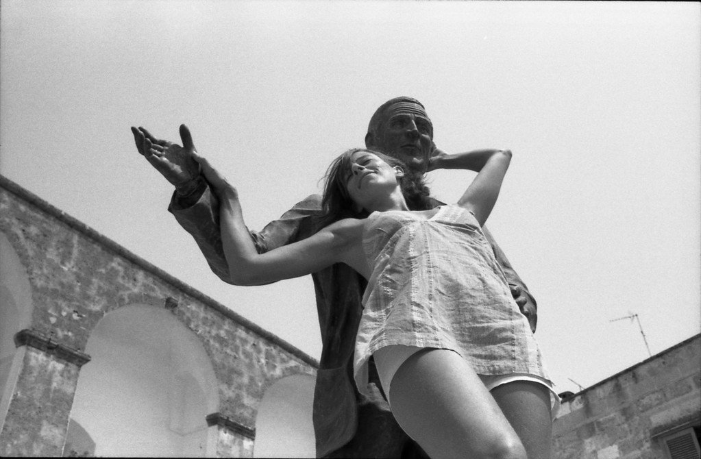 Luci Uni spesso ricerca un suono musicale e non solo nelle note, ma dentro parole, dettagli, oggetti, o come in questo caso, in un mezzo di trasporto. Mossa dalla volontà di estrarre senso dal proprio lavoro per nutrire prima di tutto se stessa qui presenta il video "Preghiera a mio padre" con musica di Daniele Di Bonaventura, definito il miglior Bandoneista che abbiamo in Italia. Il video è girato a Milano e riprende dall'interno e all'esterno un autobus doppio, a mantice. Il montaggio è costruito cercando l'esatta sincronia del mantice dello strumento con quello dell'autobus, in modo tale che l'autobus stesso sembri suonarla. La musica del bandoneon, accompagna il viaggio. Malleabile e di forma quadrangolare produce pieghe a fisarmonica simili al bus. Il Bandoneon nasceva per svolgere funzioni religiose all'aperto e al principio era chiamato organo a gamba. Nato in Germania, per alcuni inventato o forse soltanto reso popolare dal musicista tedesco Heinrich Band, successivamente si è affermato come lo strumento caratterizzante del tango argentino per il tipico suono struggente. E sulle note intense del "pensiero triste che si balla" come viene definito nella tradizione porteña il tango, chiude la mostra la performance di Guendalina Salini “Don Tonino danza il tango”, fotografata da Alessandro Cicoria, mentre duetta con la statua di Don Tonino Bello a Tricase in Puglia, con cui sognava di danzare fin da piccola. Fondersi alle sensazioni da cui ha origine il tango invita a ragionare sulla miscela di varie culture da cui proviene. Dapprima i neri e gli indios iniziarono a ballarlo e a quel tempo risale il ricordo ancora molto solare del candombe, poi gli europei specie gli italiani emigrati in Argentina, diedero caratteristiche più malinconiche, nelle parole di strazio per la lontananza dalla patria, dalla madre, dall'amore.