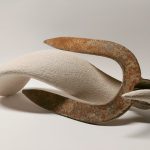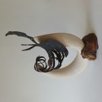 Laura Branca, nelle sue sculture dalle forme sinuose coniuga materiali come terracotta e marmo a elementi recuperati come radici, ferri, plastica.