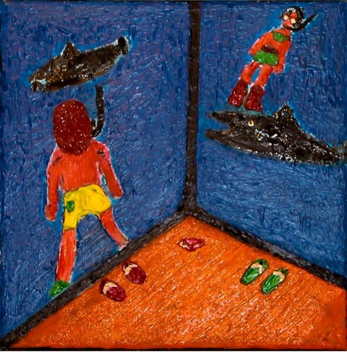 Fabrizio Molinario, artista di Novara, che ricordiamo per le sue coloratissime, istintive partite di rugby, incontri di pugilato, gare di nuoto nelle quali evidenziava l’energia, l’abilità, la virilità, presentate nel 2010 nella nostra galleria con una personale intitolata “Competition”, si è ispirato, nelle opere che presenterà in questa mostra, ad altri aspetti della vita. Vedremo dunque due nuove serie: “Le Stanze” e “Le Maschere”. Gianpiero Prassi scrive di lui a proposito delle “Maschere”: “C’è senza dubbio l’eco delle Maschere tribali africane (che del resto acchiapparono anche maestri come Pablo Picasso), l’immediatezza del disegno infantile. Poi, sotto pelle c’è l’espressionismo feroce di George Grosz che torna trasfigurato ma semmai ancor più feroce.”