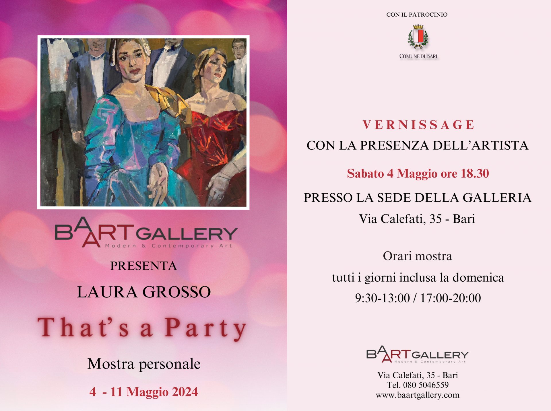 ” That’s a Party ” è il titolo della mostra personale di Laura Grosso, curata da Baart Gallery, che inaugurerà sabato 4 Maggio alle ore 18,30 presso la sede della galleria in via Calefati 35, a Bari.