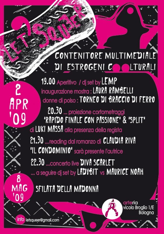 LET'S QUEER – contenitore multimediale di estrogeni coolturali presenta il nuovo evento di Giovedì 2 aprile 2009, ospitato dal locale bolognese underground di vicolo broglio, Arteria ( www.arteria.bo.it ).