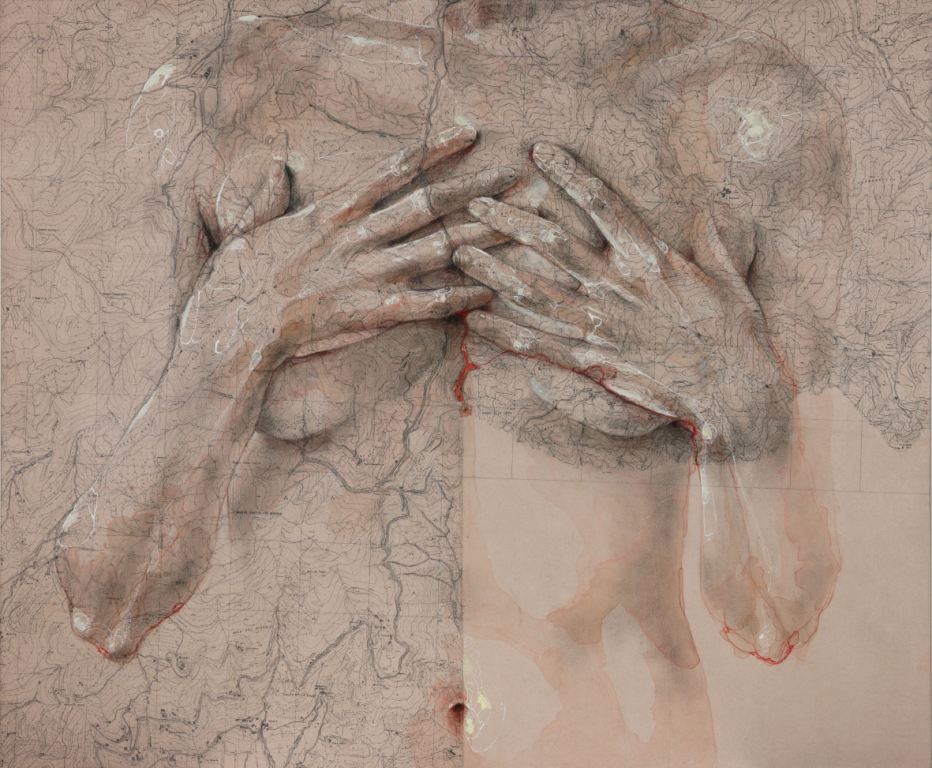 «Le cartografie sono la rappresentazione simbolica di informazioni tecniche e scientifiche. Nel mio lavoro le utilizzo perché contengono dati esatti, descrivono luoghi, distanze, aspetto e struttura – spiega la pittrice. – Mi affascina la relazione tra la biologia dell'essere umano e queste carte complesse, che richiedono informazioni e competenze per essere decodificate. Nascono così racconti, quasi confidenze che parlano di identità, legami e ricerca di una piccola particella a cui appartenere».