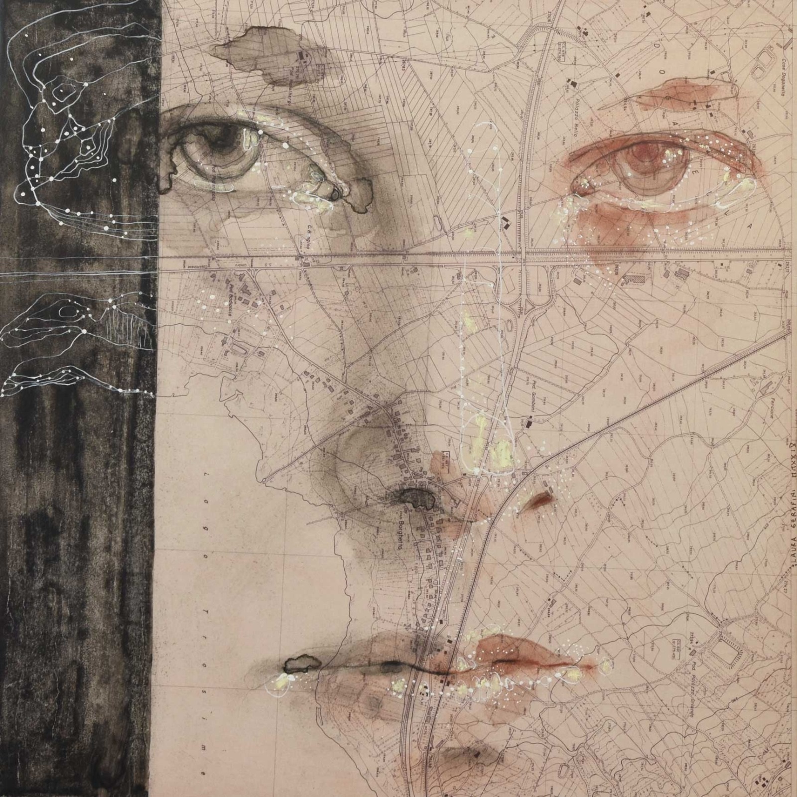 “Laura Serafini ci guida a una osservazione extra-territoriale – scrivono le curatrici. – Le sue mappe sono il supporto e il tramite per descrivere e raccontare una trama, delineare un destino errante tra terra e cielo, che passa attraverso il corpo, dai volti e dagli sguardi, per rappresentare un'identità nascosta e misteriosa”.