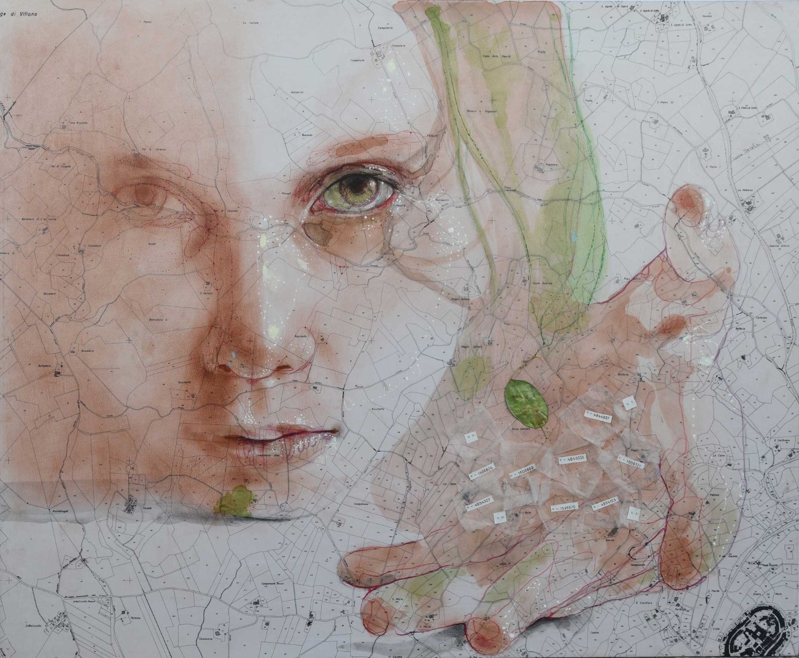 L’artista aretina presenta viaggi dove si cammina su percorsi antichi, che legano lo spirito terreno a quello di mappe celesti: in mezzo c’è il corpo femminile che trattiene in sé un significato, un corpo fisico e quasi ascetico, in una preghiera piegata alla riflessione delle strade percorse.