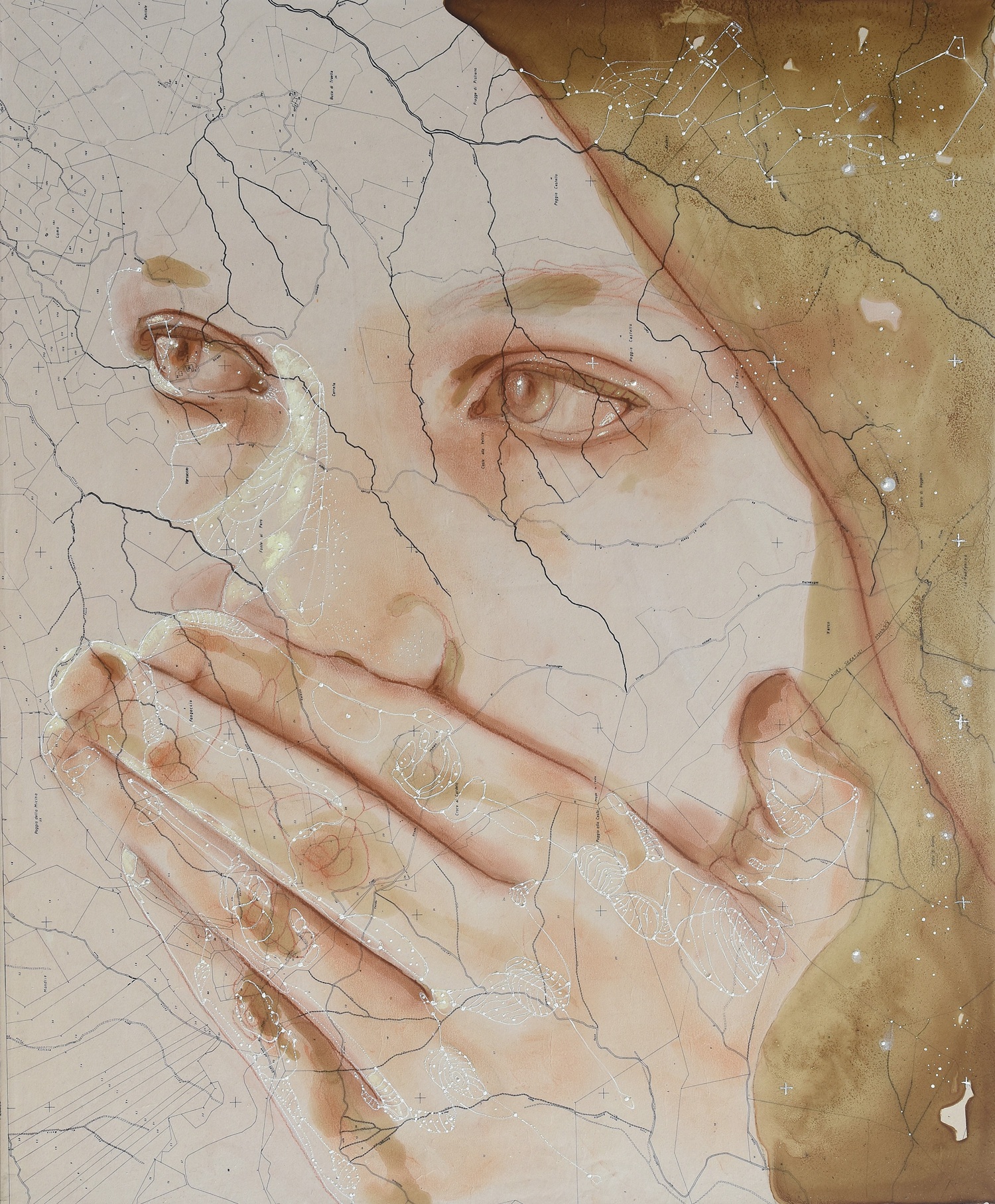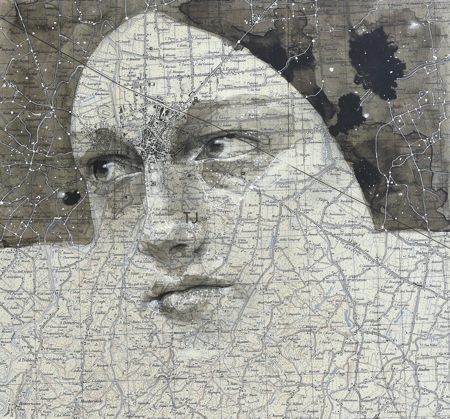 Nelle opere i corpi e i volti in cerca del sublime sorgono lievi dal tracciato tecnico, liberi di interagire con il supporto senza mai dominarlo: china, carboncino, acquerelli e media trasparenti permettono ai livelli di sovrapporsi e confondersi in un gioco affascinante di segni e immagini. Un continuo dialogo tra la predeterminazione di ciò che siamo e il libero arbitrio di diventare ciò che vogliamo, mentre la nostra vita fluisce. Attraverso un disegno puro, monocromatico, fatto di dettagli, ombre e spazi vuoti, la rielaborazione delle carte tecniche in senso antropologico le tramuta in rappresentazioni identitarie grazie a un linguaggio inconfondibile.