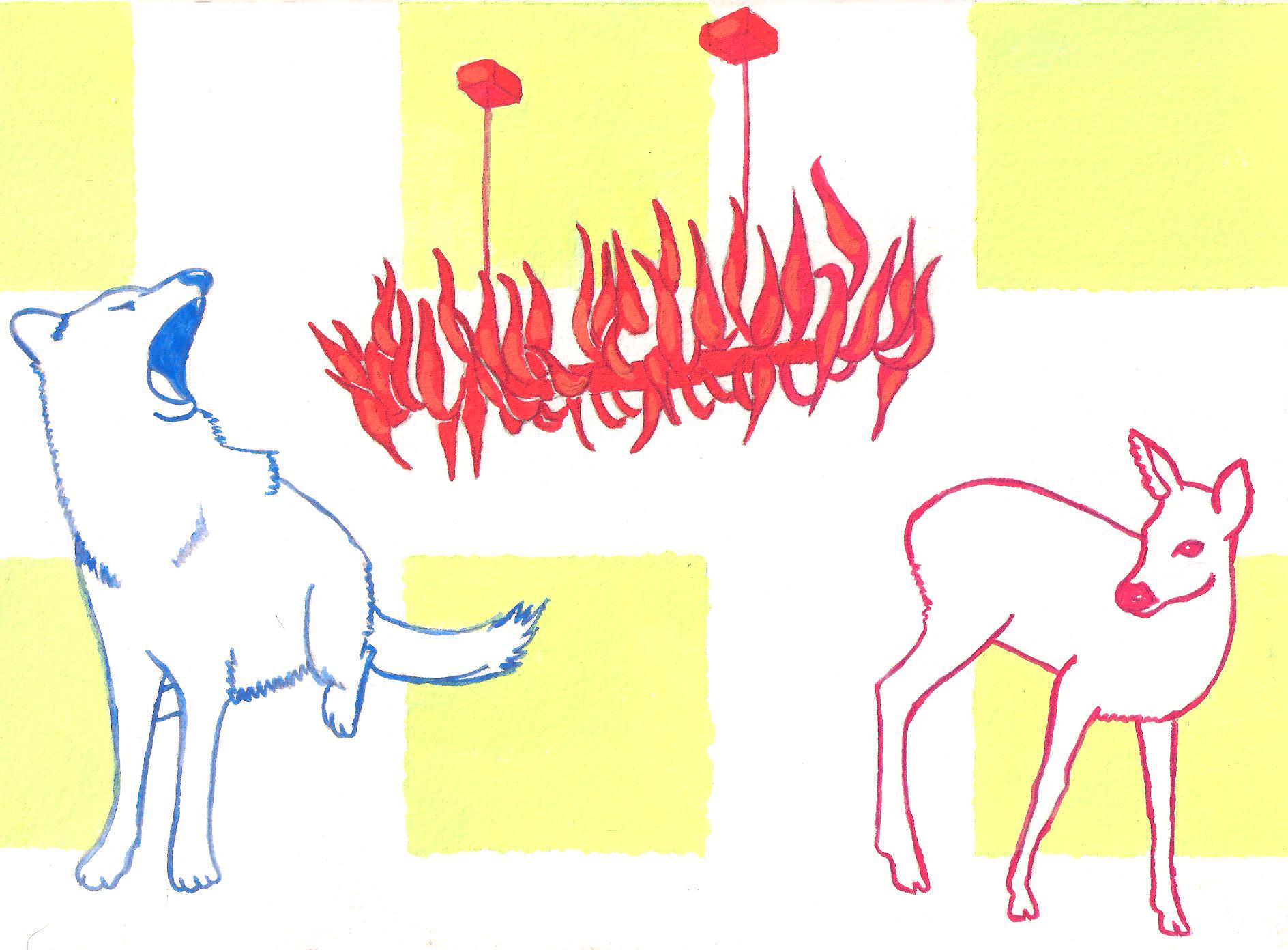 Nelle sue installazioni primaverili, pervase di una vitalità capace di cambiare il mood dello spettatore, Laura Serri si è sempre avvalsa dell’icona del cervo. Generalmente erano cervi ripresi in varie fasi della vita, dal cucciolo maculato, alla femmina con prole, al maschio adulto che barrisce nella stagione degli amori per marcare i confini nel suo harem. Con Lupus in Fabula, viene scritta una fiaba d’amore interspecifico, un amore anarchico ed incurante dei crismi della predazione e della sopravvivenza. Perché, come dicevano i francesi, si desidera e si ama con travolgente passione solo chi potrebbe davvero distruggerci. E quindi la cerbiatta si innamora del lupo, e anche il lupo viene risucchiato dal vortice. I due si studiano, si inseguono, giocano, litigano. Il lupo si arrende ululando e la cerva fa l’indifferente. Poi lui invita lei a giocare con l’irresistibile mossa lupoide di stendere le zampe davanti e buttare il sedere per aria. Il lupo si appallottola a dormire, e la cerva gli si appoggia addosso. Insomma, i litigi e le rappacificazioni sono cicliche, proprio come la primavera. Lupus In Fabula rappresenta la possibilità di un rinnovamento radicale, incredibile, che demolisca per sempre la legge del più forte.