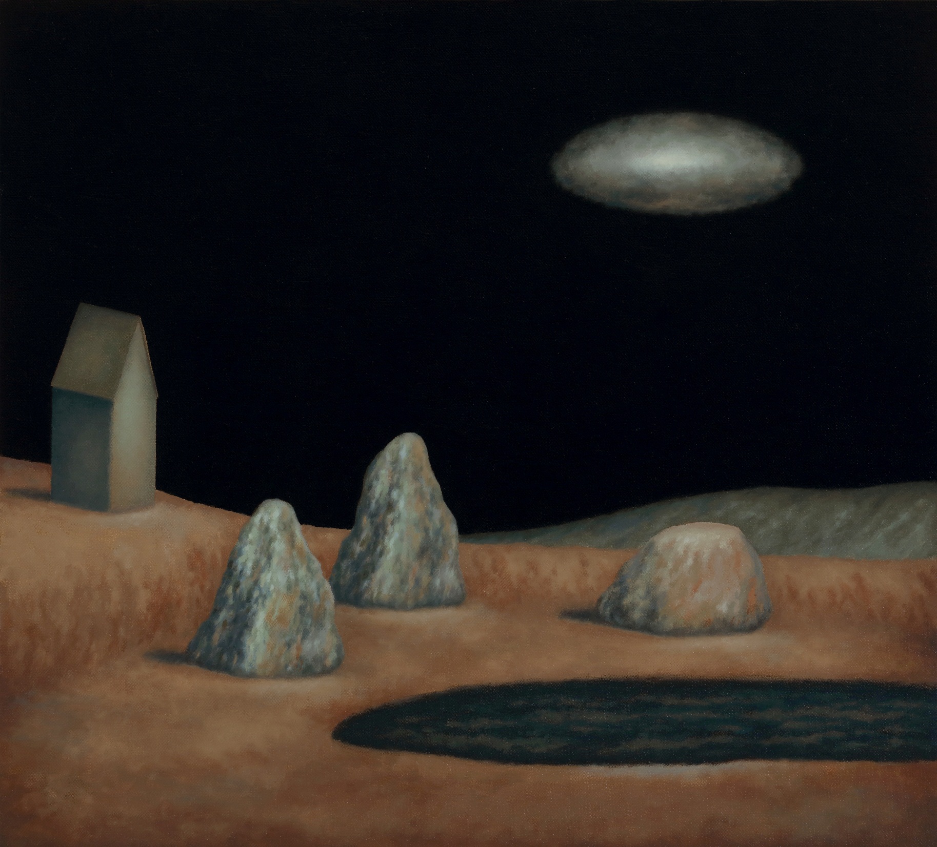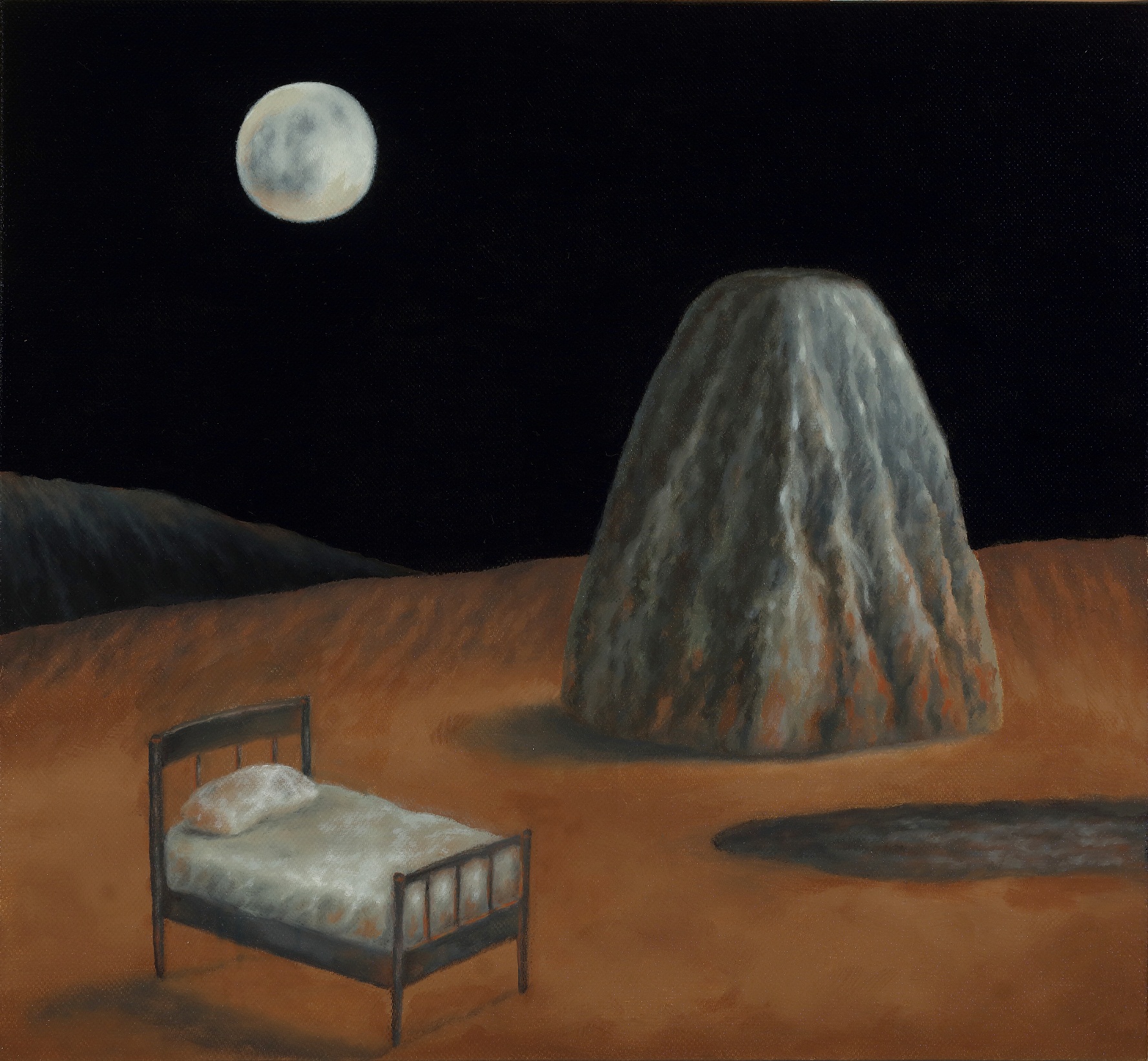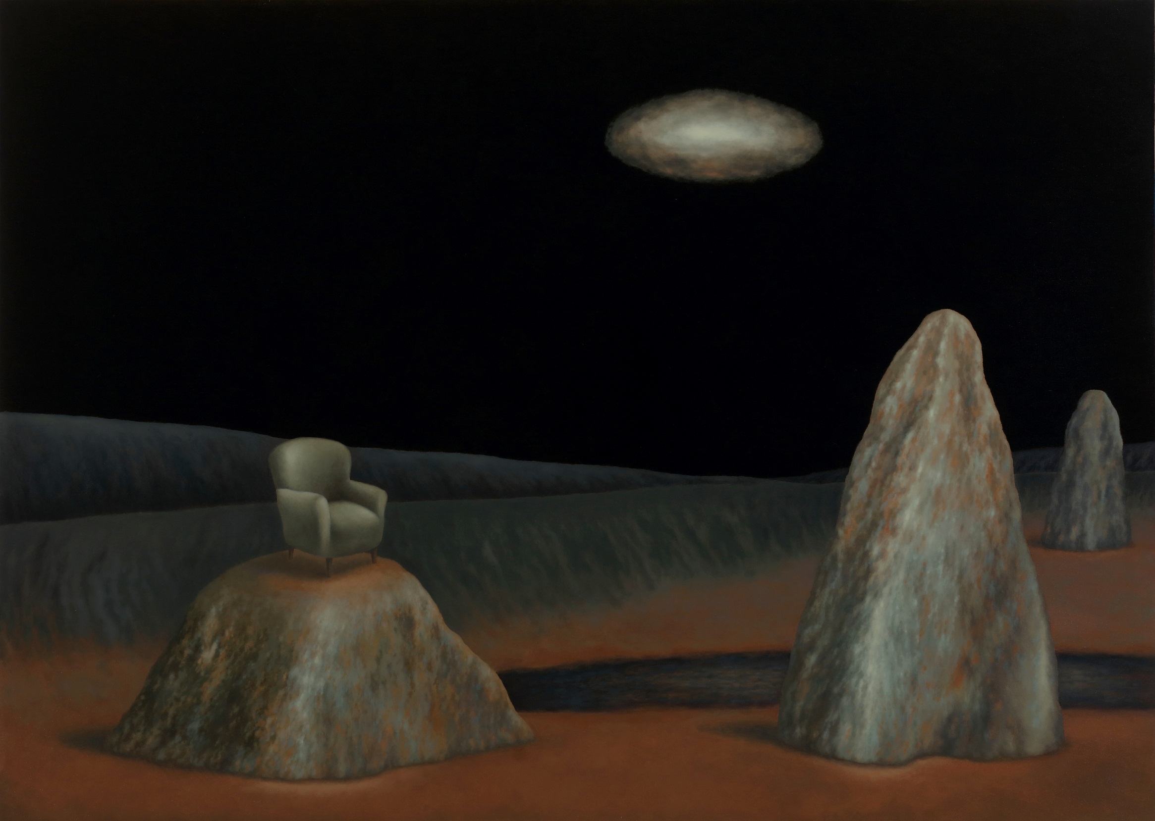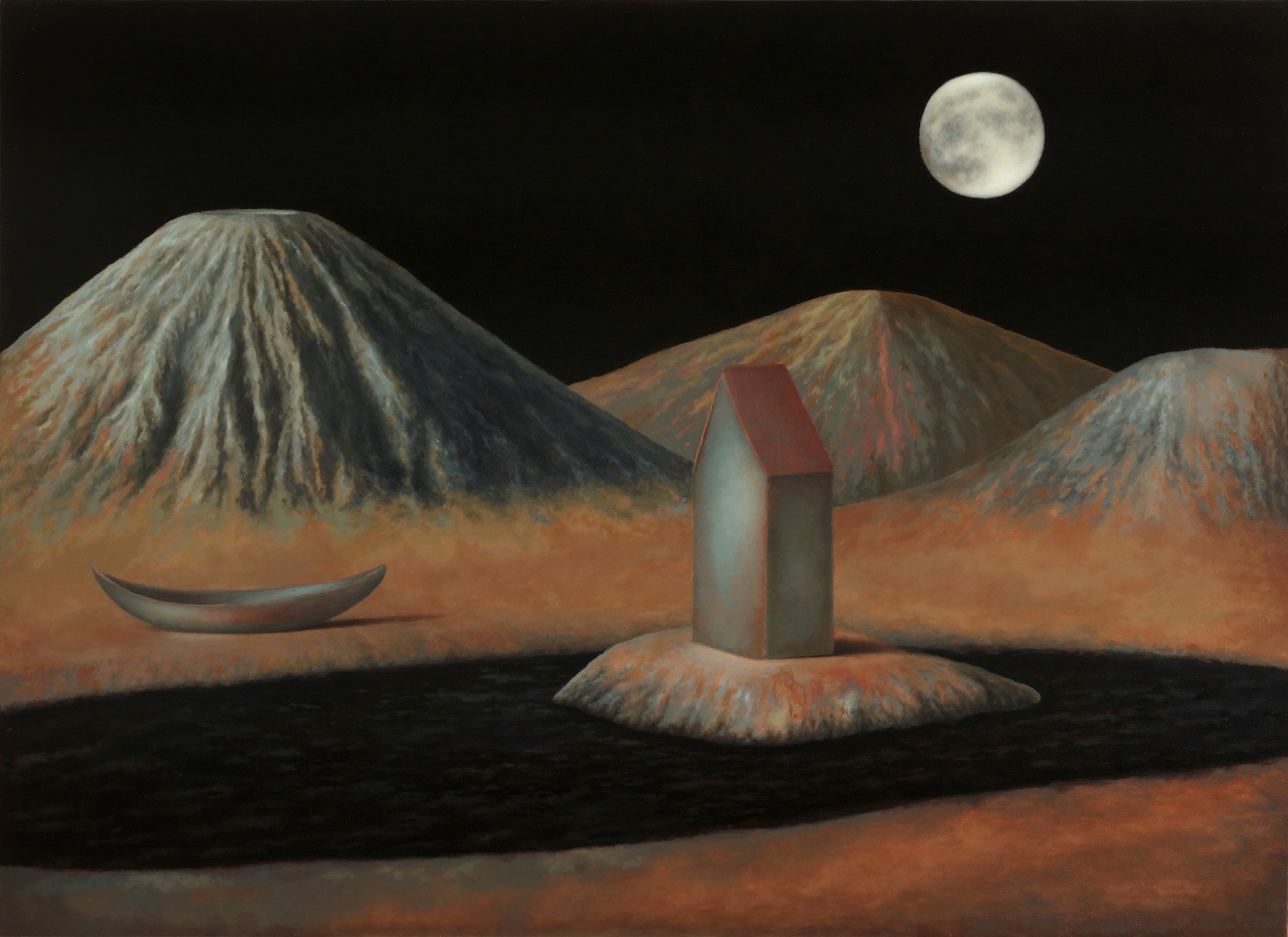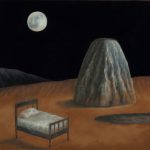 Ecco allora la casa e la barca, il dirupo e la laguna. Scorci antidiluviani e vestigia di civiltà perdute fanno da sfondo a elementi sottratti al quotidiano, presenze insieme iconiche e feriali. Un lampione, una poltrona, un letto. Citazioni minime da Van Gogh e della sua stanza di Arles. Su tutto domina una luna piena e pallida ritagliata in una notte nera. Qui lo studio della composizione, che distilla tracce di vissuto affiorate dalla coscienza come indizi di una narrazione interrotta, trova nella luce una variabile. E una possibilità. Che allunga le ombre sulla sabbia. Che stempera l'inquietudine nel conforto della reminiscenza.
