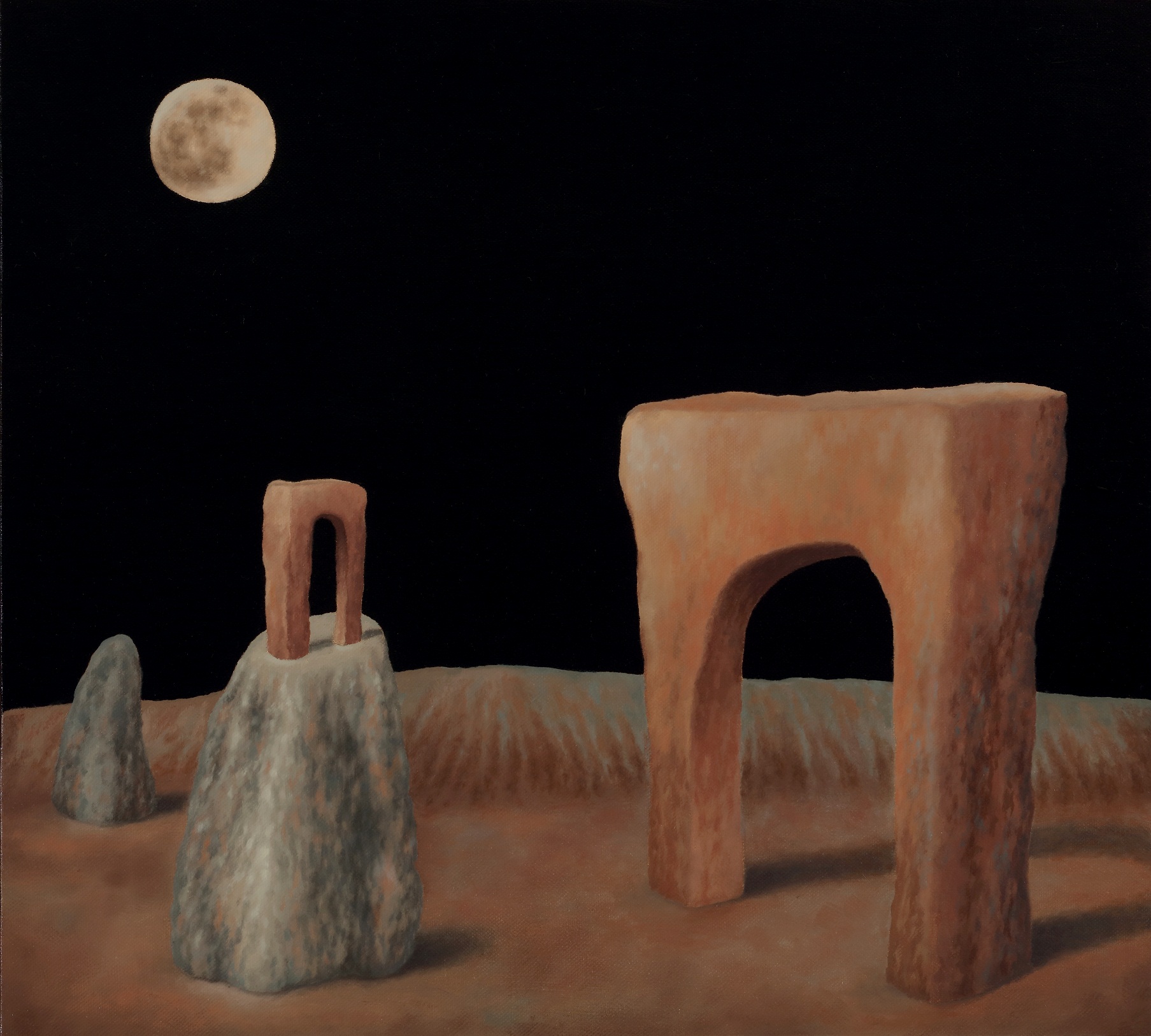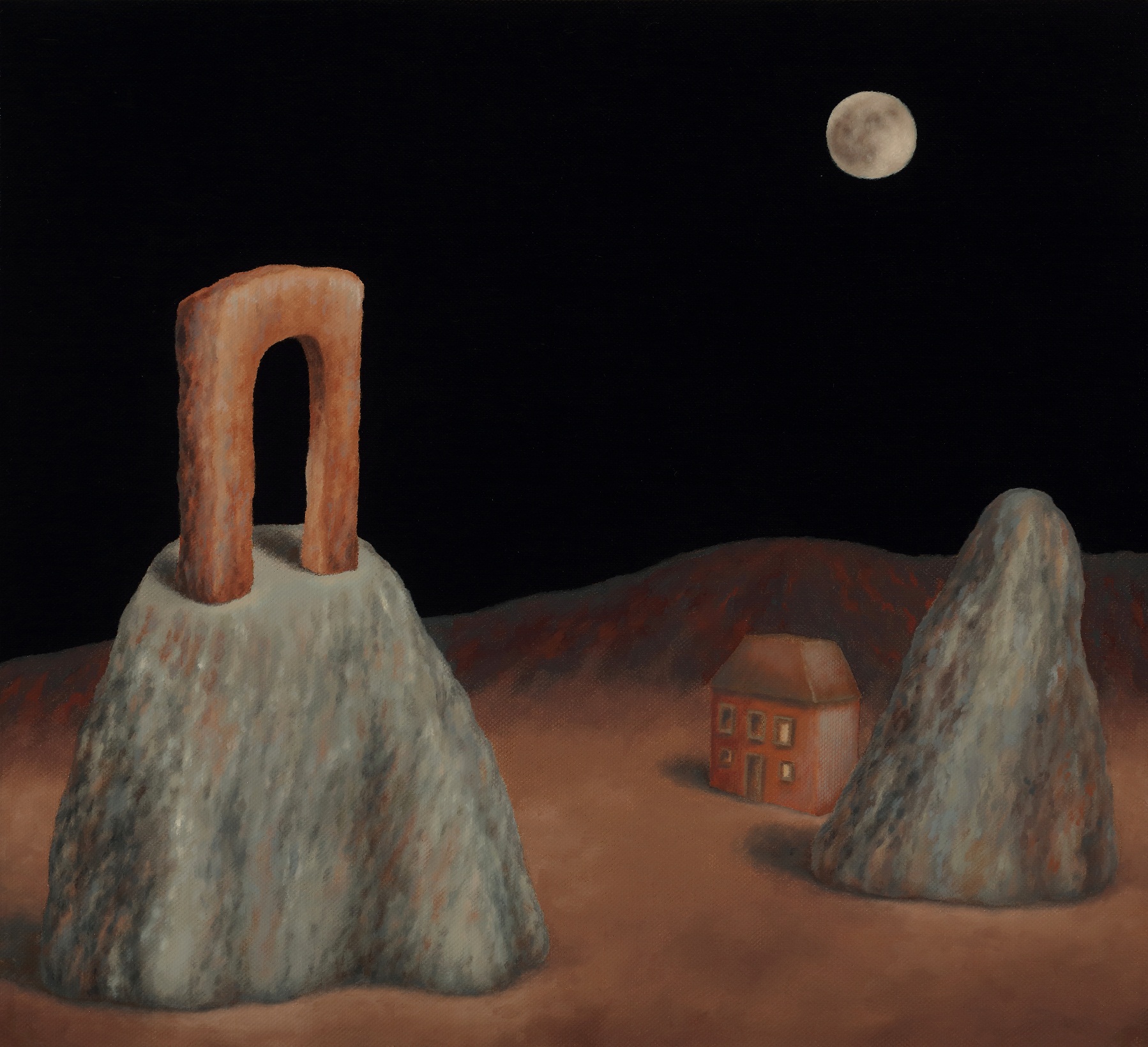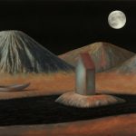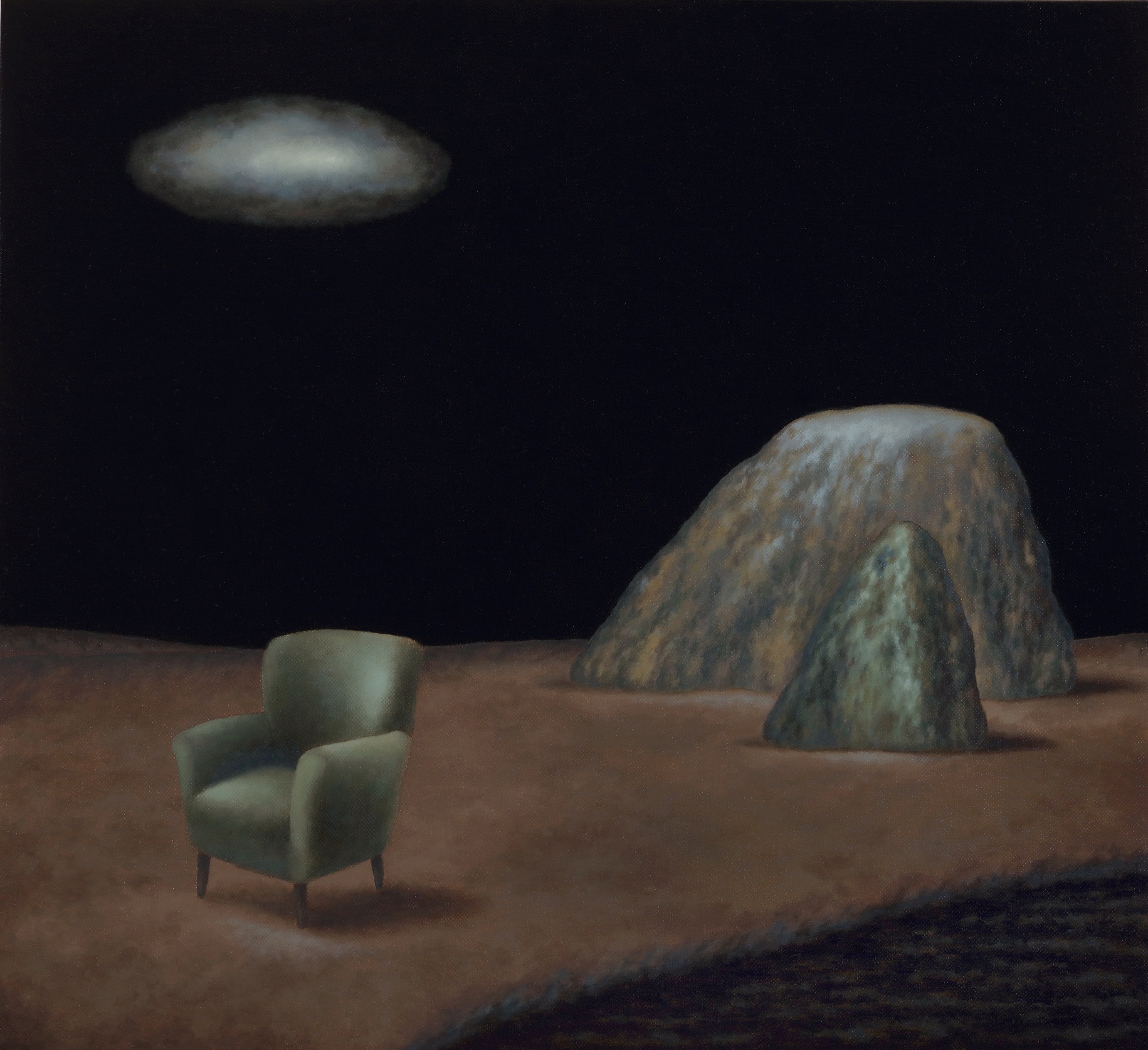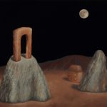 Ecco allora la casa e la barca, il dirupo e la laguna. Scorci antidiluviani e vestigia di civiltà perdute fanno da sfondo a elementi sottratti al quotidiano, presenze insieme iconiche e feriali. Un lampione, una poltrona, un letto. Citazioni minime da Van Gogh e della sua stanza di Arles. Su tutto domina una luna piena e pallida ritagliata in una notte nera. Qui lo studio della composizione, che distilla tracce di vissuto affiorate dalla coscienza come indizi di una narrazione interrotta, trova nella luce una variabile. E una possibilità. Che allunga le ombre sulla sabbia. Che stempera l'inquietudine nel conforto della reminiscenza.