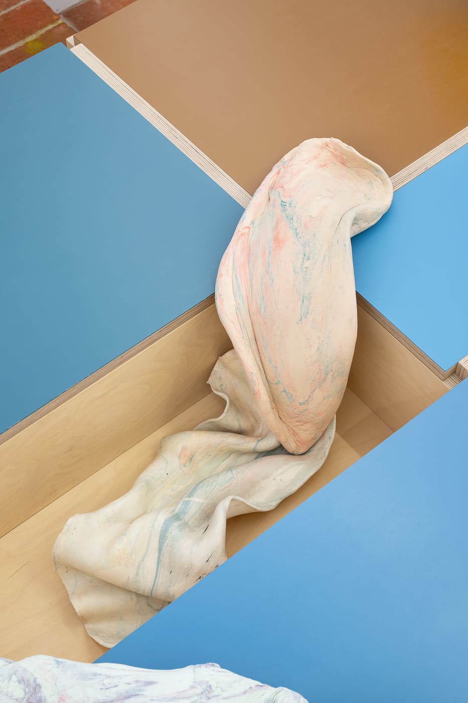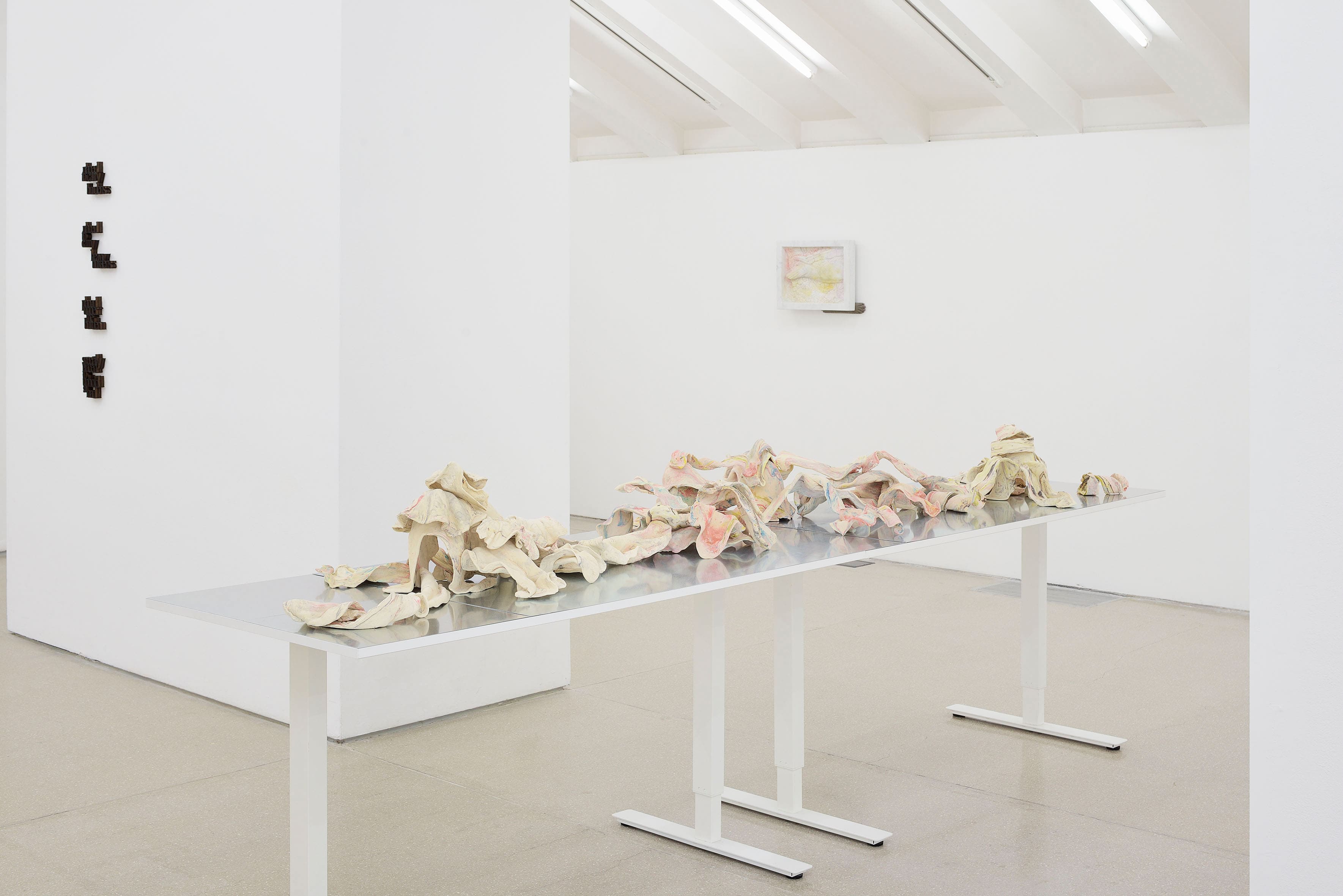 Allo stesso modo, Laura White crea un'installazione site-specific che indaga la pasta come mezzo scultoreo. L'installazione prevede una piattaforma che attraversa il centro dello spazio, intrecciandosi tra i pilastri. Le sue sculture di pasta occupano e abitano questa struttura rialzata, a volte cadendo sui bordi. Pieghe e increspature di pasta si muovono sulla superficie con un senso di urgenza, alcune dividendosi o rompendosi. Questi frammenti, diversi per dimensione e forma, evocano i resti di qualcosa che un tempo era intero, come le rovine di una grande struttura. I pezzi appaiono allo stesso tempo carnosi e lapidei, e ricordano i frammenti di marmo di una scultura barocca, sembrando allo stesso tempo morti e vivi. Fanno pensare alle interiora di un animale, alla pelle di un corpo umano o anche a tagli di carne marmorizzati esposti in una macelleria. Ispirandosi al concetto di Gian Lorenzo Bernini di rendere la pietra morbida come una pasta, White crea un ponte tra il quotidiano e il monumentale, permettendo al movimento e alla resistenza del materiale di guidare il suo processo artistico.