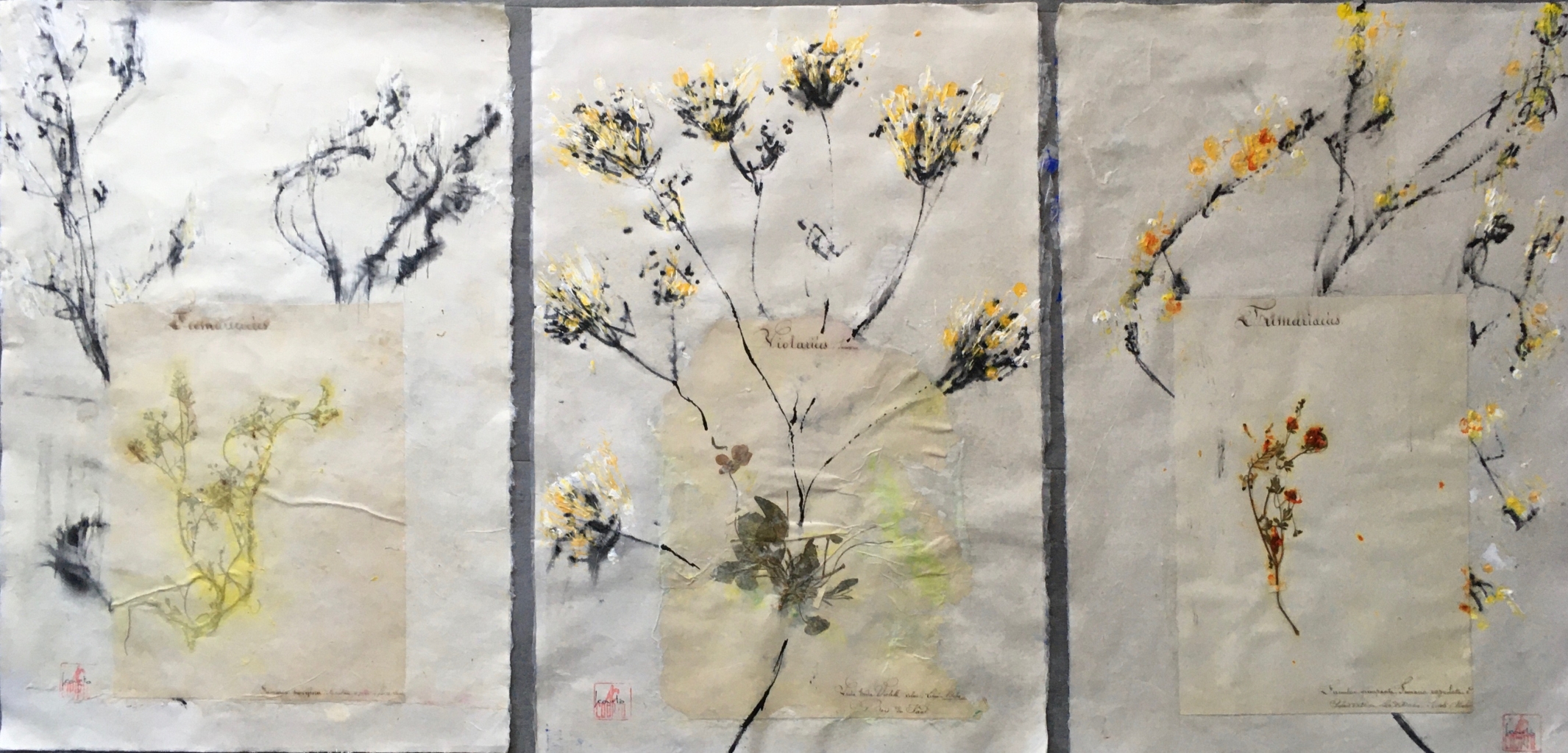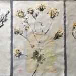 Les interventions de Laurence Courto entrent en écho avec ces plantes devenues silhouettes. Ses injections de formes et de couleurs (le noir en étant une et des plus majeures) recréent l’élan vital vers un végétal qui restait jusque là clos dans le livre. Le temps n’en finit pas de se réincarner. La peinture devient la source à laquelle s’abreuvent toutes ces feuilles et tiges.