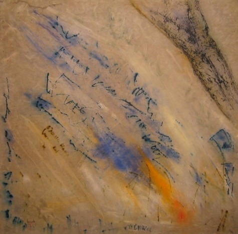 Sebbene tra i segni, poi, prevalga la parola, questa non compare mai come una scrittura chiara e leggibile, che limiterebbe la lettura dell’opera ad un preciso punto temporale, quanto piuttosto come elemento di un mare indefinito, una sorta di magma di kandinskiana memoria, in cui ad essa si mescolano altri elementi, talvolta paragonabili a note musicali o a simboli matematici. Come ebbi modo di dire a proposito di Uomo leggero (2008) 1, tale commistione “si fa sinonimo di memoria e di conoscenza che si tramanda da tempi remoti”, pertanto diviene simbolo della “modernità che poggia i suoi valori sul passato”.