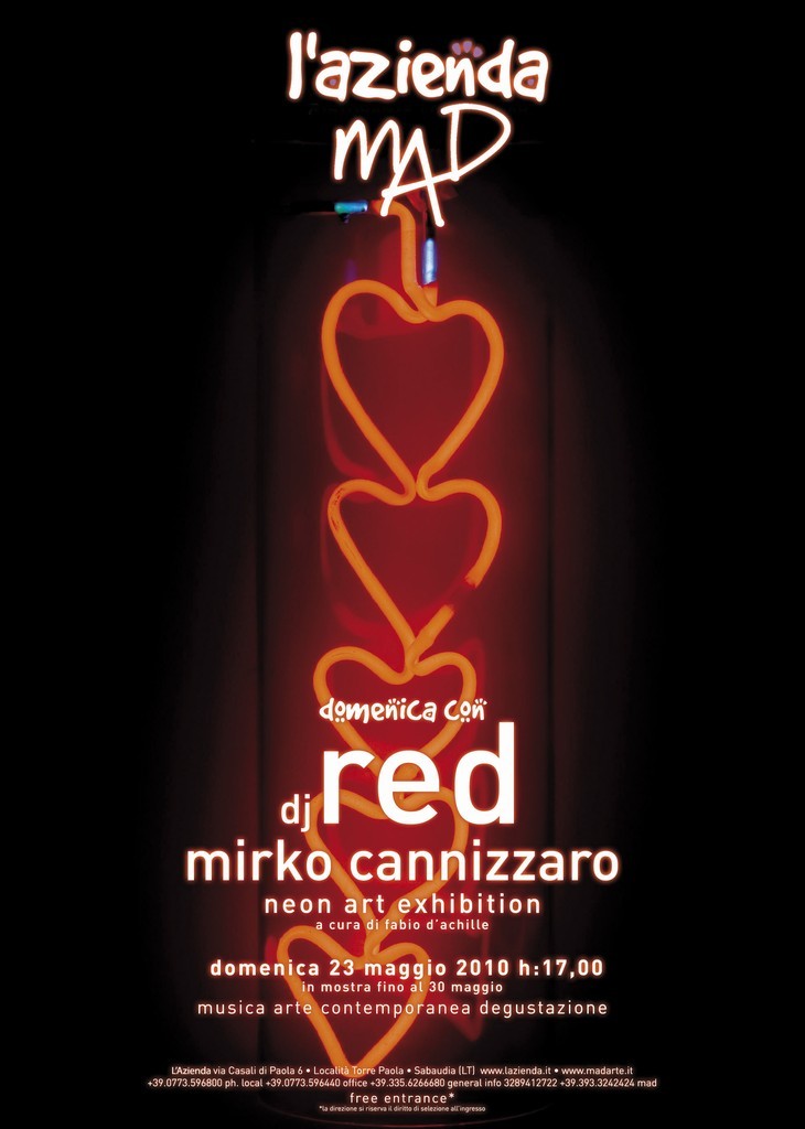 MAD rassegna d’arte contemporanea a cura di Fabio D’Achille presenta L’AZIENDAMAD, un evento che nasce dall’incontro della musica di Dj RED con l’arte di Mirko Cannizzaro, il quale presenterà per l’occasione NEON-ART exhibition, una personale di oggetti luminosi e opere d'arte con “interventi e installazioni” realizzate con il neon.