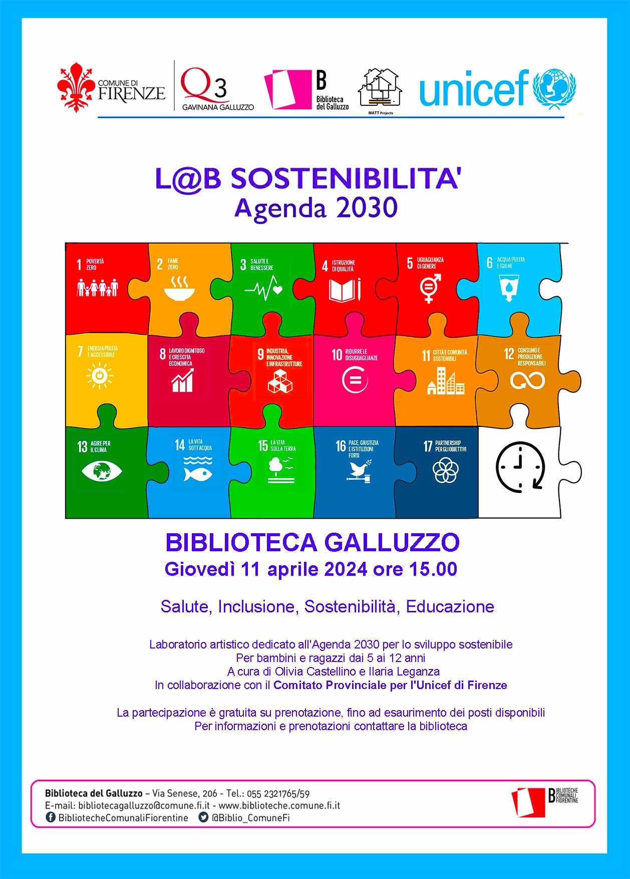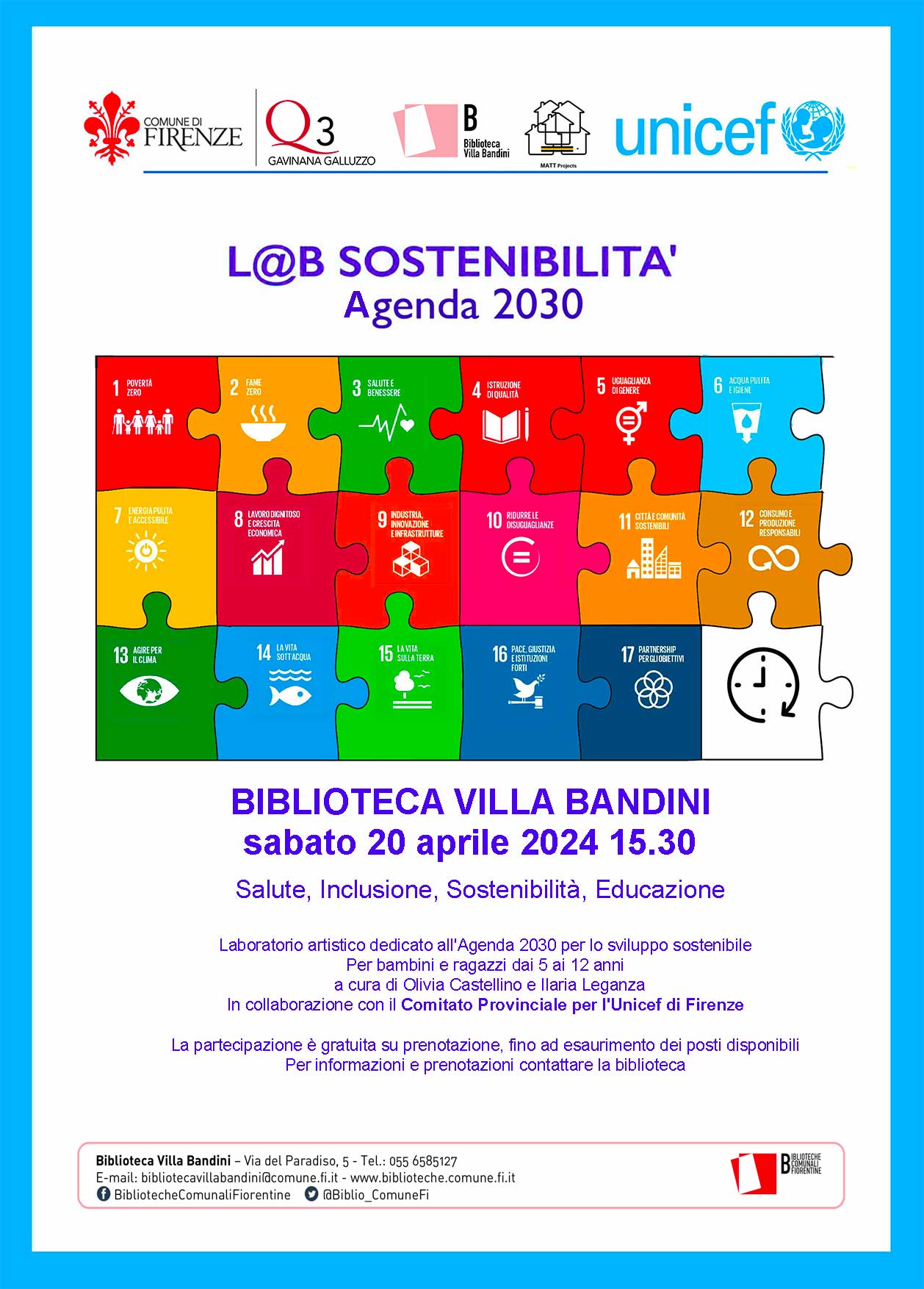Dal 17 gennaio in poi, nelle principali Biblioteche Comunali di Firenze, si svolgerà il progetto artistico educativo dal titolo "L’Arte della SoStenibilit@", un ciclo di laboratori per bambini, promosso da UNICEF Firenze: attività laboratoriale finalizzata alla sensibilizzazione dei bambini e degli adolescenti nonché alla comprensione ed interpretazione del tema legato allo sviluppo sostenibile. Si prefigge l'obiettivo di rendere quanto più possibile cosciente e responsabile delle proprie azioni l'uomo del domani, in considerazione dei numerosi cambiamenti ambientali, su scala mondiale, registrati negli ultimi anni.