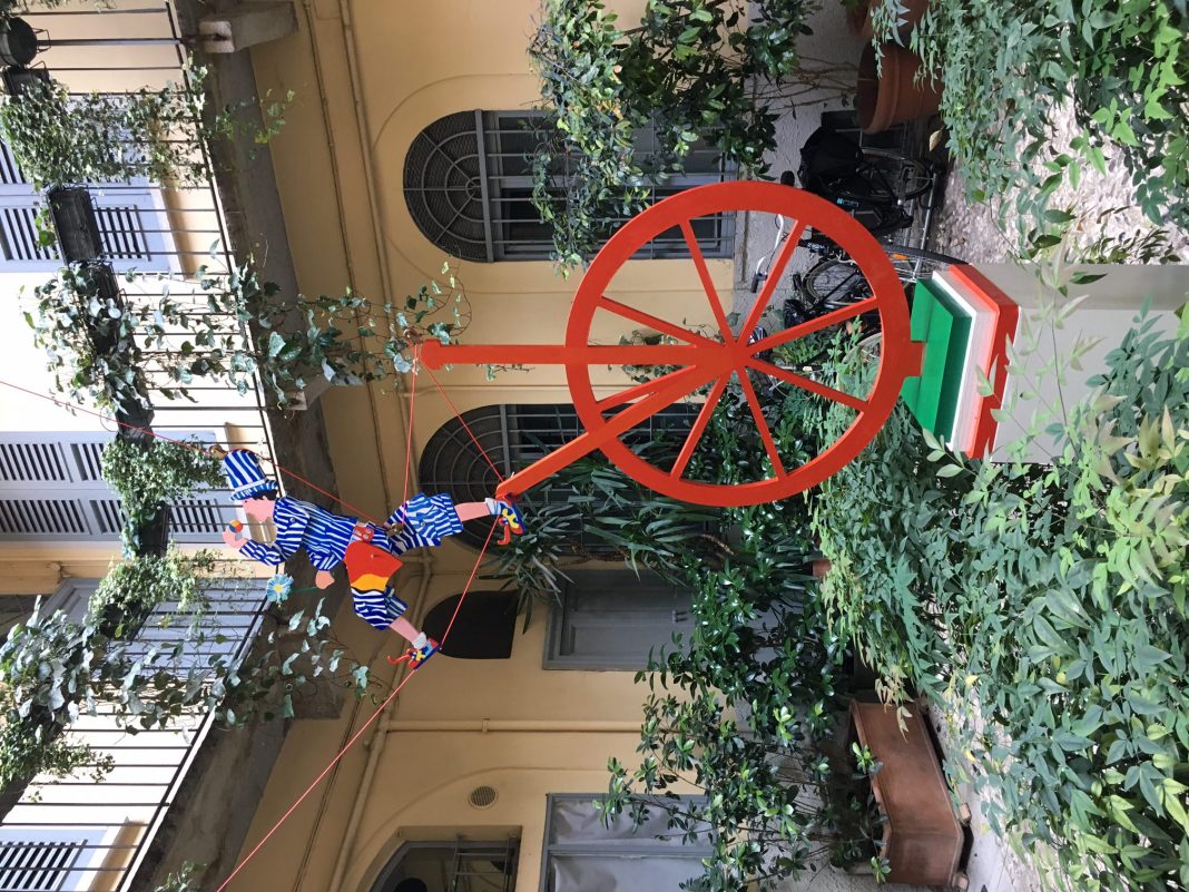 Più di mille persone, mosse dal motto “Qui non si lavora, si gioca”, hanno collaborato a realizzare l'acrobatico salto della scultura Il mangiatore di mondi, che ritrae il filosofo Andrea Bortolon innamorato che pedala su di un monociclo.