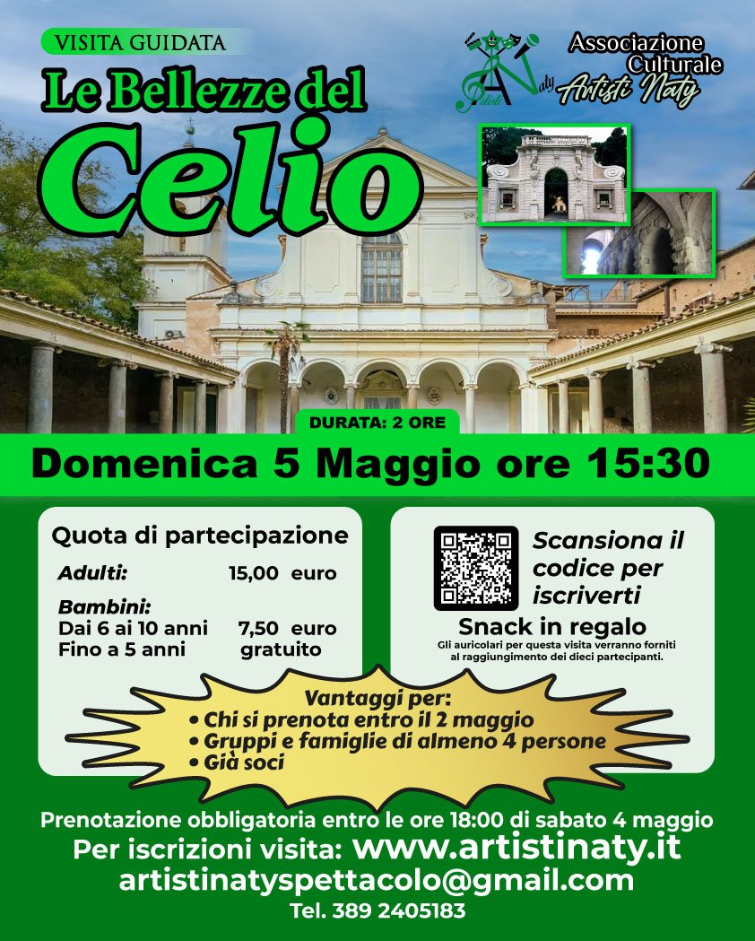 Visita Guidata, domenica 5 maggio ore 15:30 Prenotazione Obbligatoria, cliccando sul seguente link: https://artistinaty.it/event/le-bellezze-del-celio/