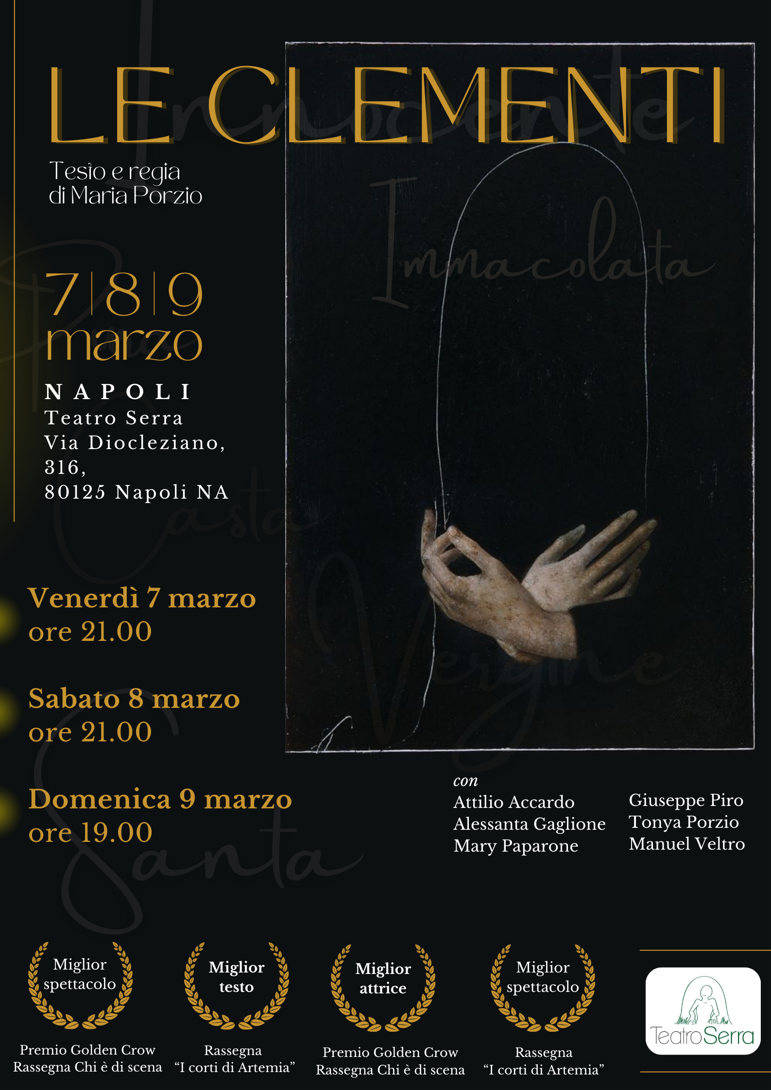Debutta al Teatro Serra di Napoli “Le clementi”, trilogia di testi brevi di Maria Porzio a cura di Hirondelle sulle donne nella Bibbia il primo dei quali, “L’immacolata” è “Migliore Spettacolo” alla Golden Crown di MaxArt&Co e “Migliore Testo” e “Migliore Spettacolo” al Festival “InCorti da Artemia” dell’omonimo centro romano, gemellato con lo spazio flegreo. Dal 7 al 9 marzo in Via Diocleziano 316 (venerdì ore 21:00, sabato ore 19:00, domenica ore 18:00). Info: teatroserra@gmail.com, 347.8051793.