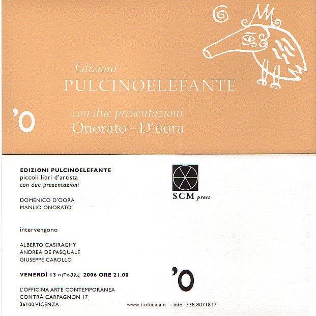 Alle edizioni Pulcinoelefante ha voluto dedicare un omaggio anche “L’Officina” di contrà Carpagnon, a Vicenza, presentando per l’occasione i due libretti realizzati rispettivamente da Domenico D’Oora e Manlio Onorato; in mostra anche alcune opere su carta dei due artisti.