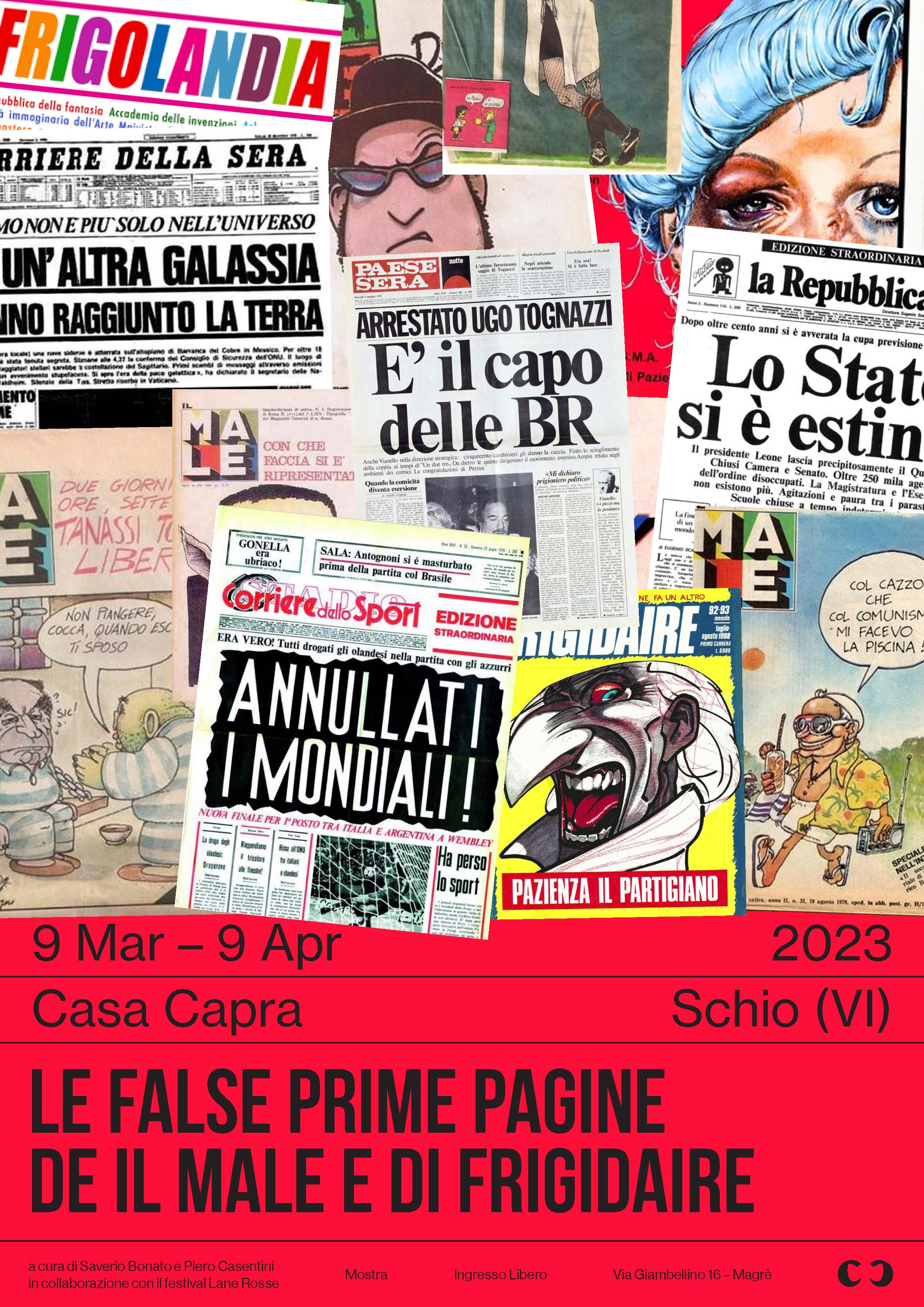 In occasione del festival Lane Rosse al Circolo Operaio di Magrè, Casa Capra inaugura la mostra dedicata alle false prime pagine, realizzate tra il 1978 e il 1991, della rivista satirica il Male e di Frigidaire, già esposte nel 2010 all’interno di Palazzo Fogazzaro nella mostra “Il Male non è morto”