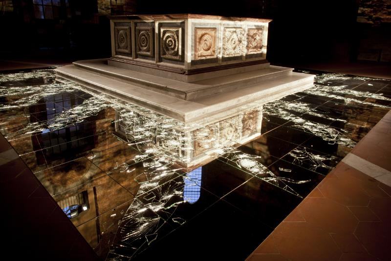 La grande installazione di Federico Gori (Prato 1977, vive e lavora a Pistoia), neo vincitore del Premio Metaenergia del Talent Prize di Roma, presenta “Corri a dire al re che il cielo sta crollando” verso tratto dall'Apocalisse di San Giovanni: un pavimento di specchi che l'artista ha inciso e pensato per il Battistero di San Giovanni a Pistoia, traducendo in installazione una scena dell'annuncio al re in cui appare la visione della caduta del cielo. L'installazione, fatta di specchi frantumati e incisi ad arte con punta di diamante, segue l'ordine formale che si sviluppava attorno al fonte battesimale. Sono incisioni che richiamano alla mente rivoli d'acqua oppure radici e che viene adattata per le sale affrescate di Palazzo Tagliaferro.