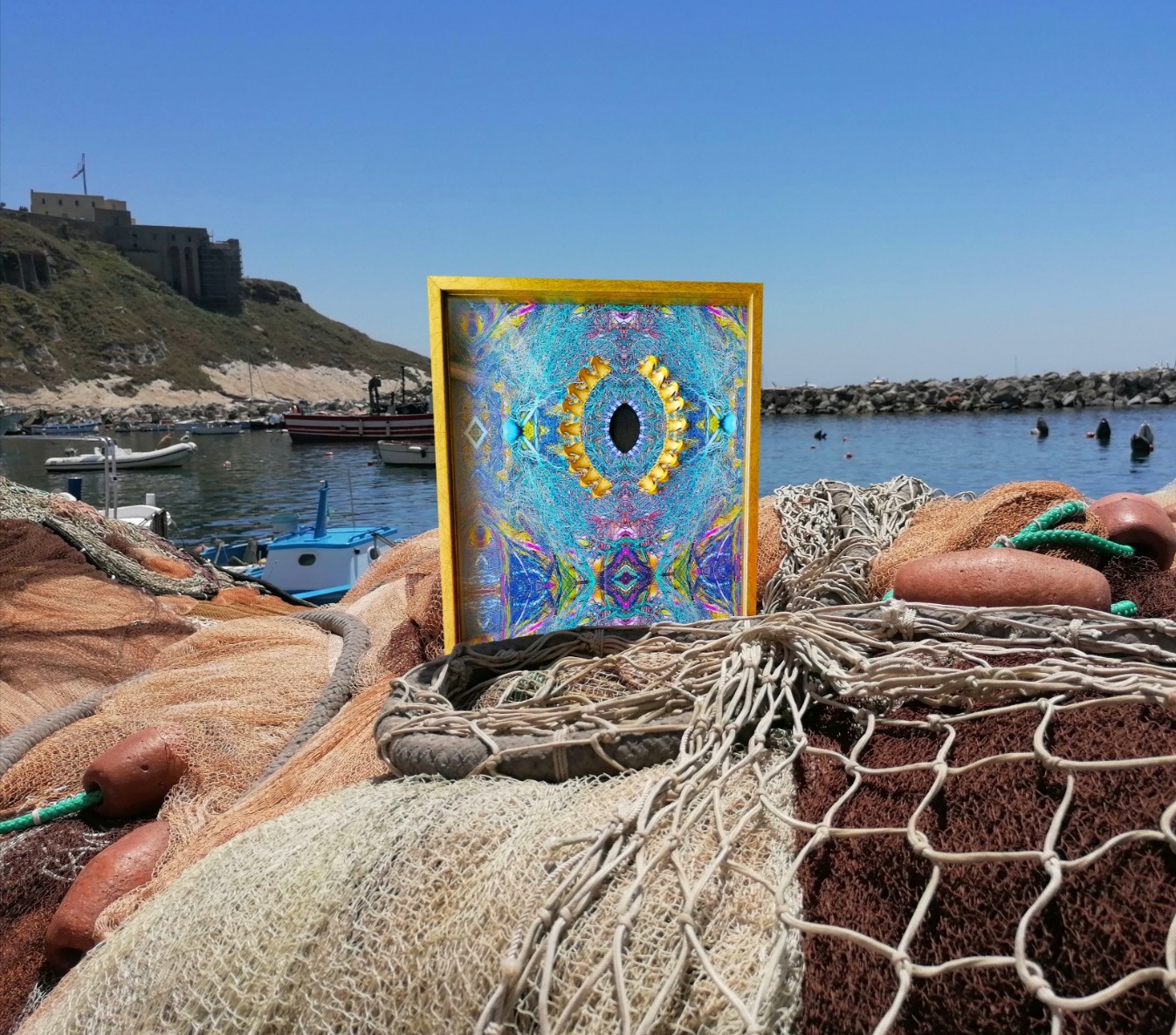 Mare presente prepotentemente in ogni lavoro della serie “Le orme sull’acqua” (gioco di parole nato dal desiderio di far scendere a zero l’impronta ecologica sul pianeta delle attività correlate alla pesca) nata con l’intento di denunciare il marine litter, la sovrapesca e la pesca fantasma, fenomeni nefasti per il suo ecosistema. E non è un caso che Procida, luogo in cui il mare, la pesca e le relative tradizioni costituiscono il genius loci, sia per l’artista fonte continua di ispirazione: nella mostra procidana saranno esposti anche “I Quadrilli”, opere inedite che riprendono una espressione tipica e misteriosa della cultura dell’isola, sospesa tra fede e profezia. Spiega la curatrice Antonella Nigro: “I Quadrilli, nati come preziose reliquie alle quali affidarsi attraverso la devozione, diventano, nel tempo, oggetti divinatori, che solo alcune lettrici erano in grado di interpretare. Gilda Pantuliano propone iconograficamente la stessa struttura simmetrica, le sue opere ispirate ai Quadrilli ed eseguite con tecnica mista su collage fotografico digitale si sviluppano da un fulcro che, a raggiera, spande forme, dirama traslazioni, crea rotazioni e vibrazioni legate, come nello studio più noto e proprio dell’artista, alle reti da pesca e al mare”.