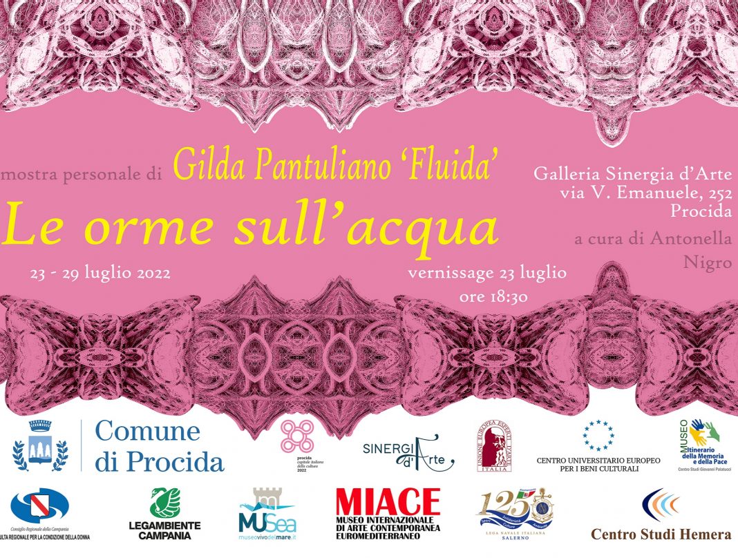 La mostra personale “Le orme sull’acqua” a Procida è patrocinata da: Comune di Procida, Procida Capitale Italiana della Cultura 2022, Consulta Femminile della Regione Campania, Legambiente Campania, Lega Navale Italiana - Salerno, MUSea Museo Vivo del Mare di Pioppi, Museo Internazionale d’arte Contemporanea Euromediterraneo MIACE, Museo Itinerario della Memoria e della Pace G. Palatucci, Unione Europea Esperti d’Arte Onlus, Centro Universitario Europeo per i BBCC, Centro Studi Hemera.