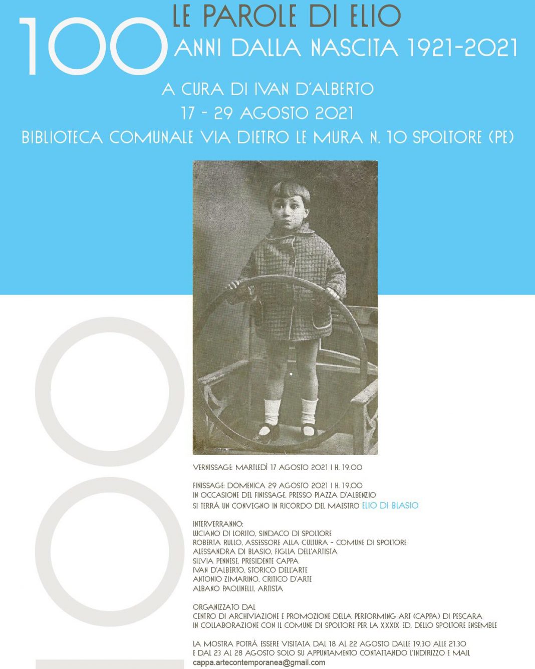 In occasione del centenario dalla nascita del Maestro Elio Di Blasio (29.08.1921), il Centro di Archiviazione e Promozione della Performing Art (CAPPA) di Pescara presenta un omaggio dedicato all’artista abruzzese, deceduto nel 2004. Elio Di Blasio, originario della città di Chieti, per molti anni ha avuto il suo studio a Spoltore, centro che aveva eletto a sua seconda casa. Il progetto espositivo nasce da un’intervista realizzata dallo storico dell’arte, Ivan D’Alberto, pochi mesi prima dalla morte dell’artista.
