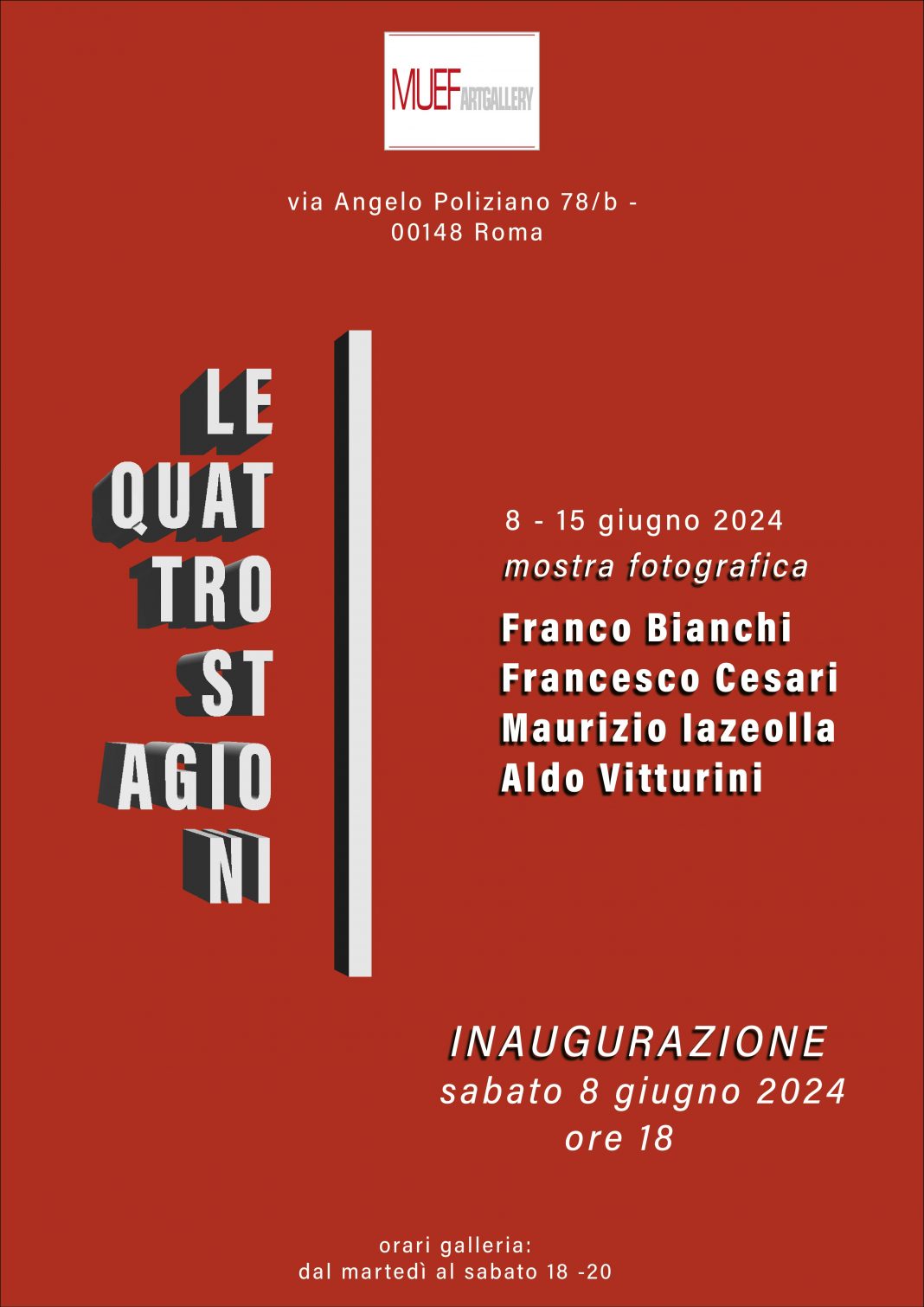 Il Muef ArtGallery ha pensato a una mostra dal tema “Le quattro stagioni” per lasciar esprimere il talento di quattro fotografi. Ognuno a proprio modo ha interpretato il tema e affrontato secondo il proprio punto di vista. Così si stratifica tutta una serie di possibili sensi e attributi di lettura, che considera ovviamente il ciclo astronomico solo come pretesto alla base di un farsi dell’immagine a tutt’altro scopo e raffigurazione.