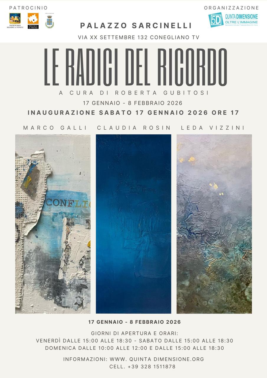 La mostra Le radici del ricordo presenta la produzione recente degli artisti Marco Galli, Claudia Rosin e Leda Vizzini che indirizzano la loro ricerca verso la realtà indefinita della memoria attraverso diverse modalità espressive.