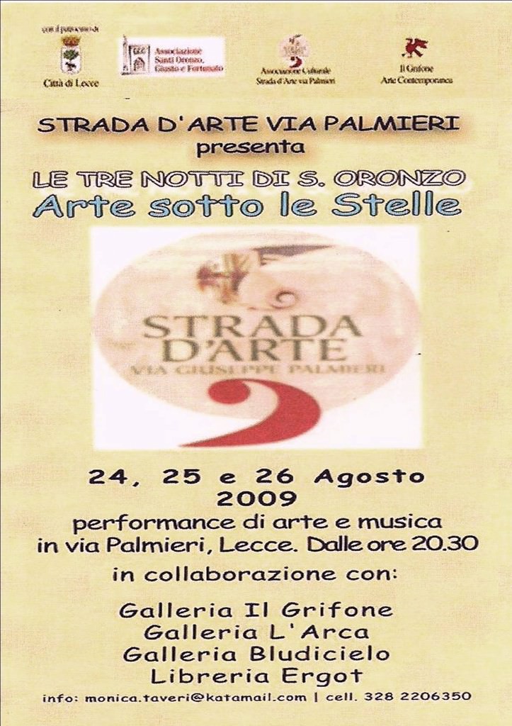 Il Presidente dell’Associazione “Strada D’Arte Via Palmieri”, Carlo Faiulo, ha pensato di dare vita a “Le tre notti di S. Oronzo. Arte sotto le stelle” nelle serate del 24,25,26 agosto che si svolgerà lungo la Via Palmieri dando voce e spazio alle Arti. Gli artisti visivi saranno impegnati in un’estemporanea di pittura, scultura e fotografia. Poeti, scrittori e performer si esibiranno tra le pareti della Chiesa di San Giovanni di Dio, della Galleria Il Grifone, della Galleria Bludicielo e per tutta Via Palmieri performance, danza e Jam session dove i musicisti metteranno alla prova la loro abilità di improvvisatori.