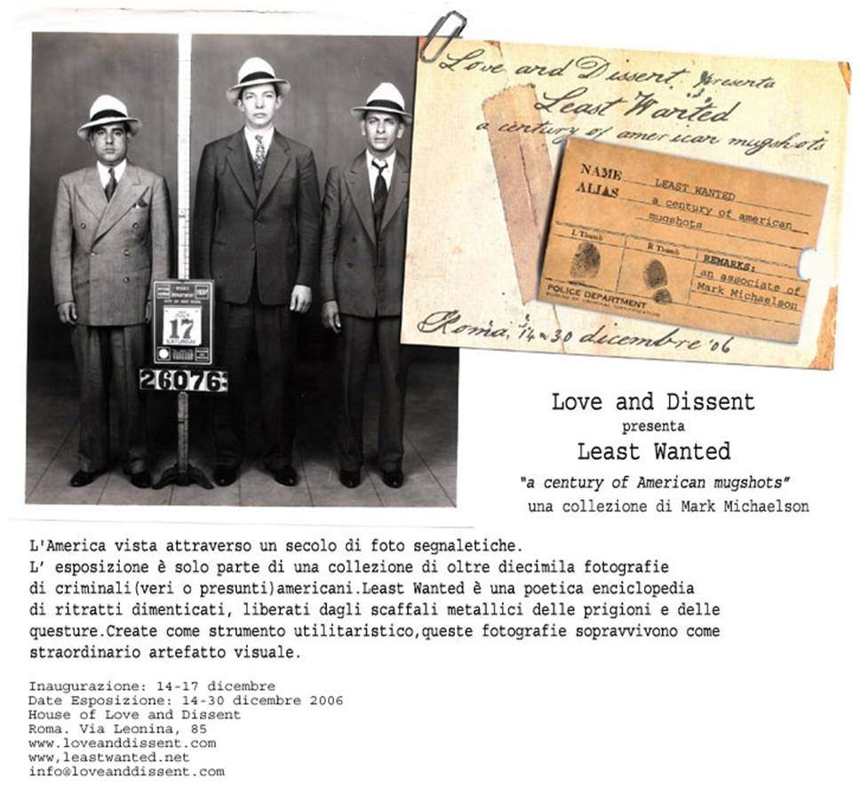L’esposizione è solo parte di una collezione di oltre diecimila foto segnaletiche di criminali (veri o presunti) che la polizia americana ha raccolto tra il 1880 e il 1970. Least Wanted è una poetica enciclopedia di ritratti dimenticati, liberati dagli scaffali metallici delle prigioni e delle questure. Create come strumento utilitaristico, sopravvivono come straordinario artefatto visuale. Puttane, sbruffoni, truffatori e coatti. Punk, laidi e miscredenti. Uomini e donne, anziani e adolescenti, ricchi e poveri, perlopiù poveri, questo è l’universo di Least Wanted.