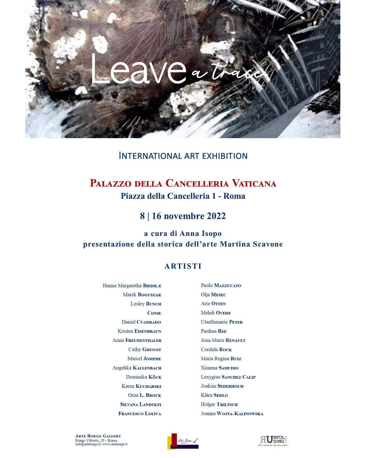 LEAVE A TRACE è il titolo della mostra a cura di Anna Isopo di Arte Borgo Gallery ospitata dall’8 al 16 Novembre 2022 nelle suggestive sale del Palazzo della Cancelleria Vaticana. Un luogo di grande valore storico, un gioiello di architettura, che si affaccia sulla piazza omonima, nel centro di Roma, vicino alla turistica Campo dei Fiori. Sede storica della Cancelleria Apostolica, il Palazzo risale alla fine del ‘400 ed è zona extraterritoriale della Santa Sede. Il piano nobile del Palazzo della Cancelleria ospita innumerevoli opere di grandi artisti: dalla volta del Salone di Studio affrescata da Perin del Vaga al celeberrimo Salone dei Cento Giorni, con un affresco di Giorgio Vasari.