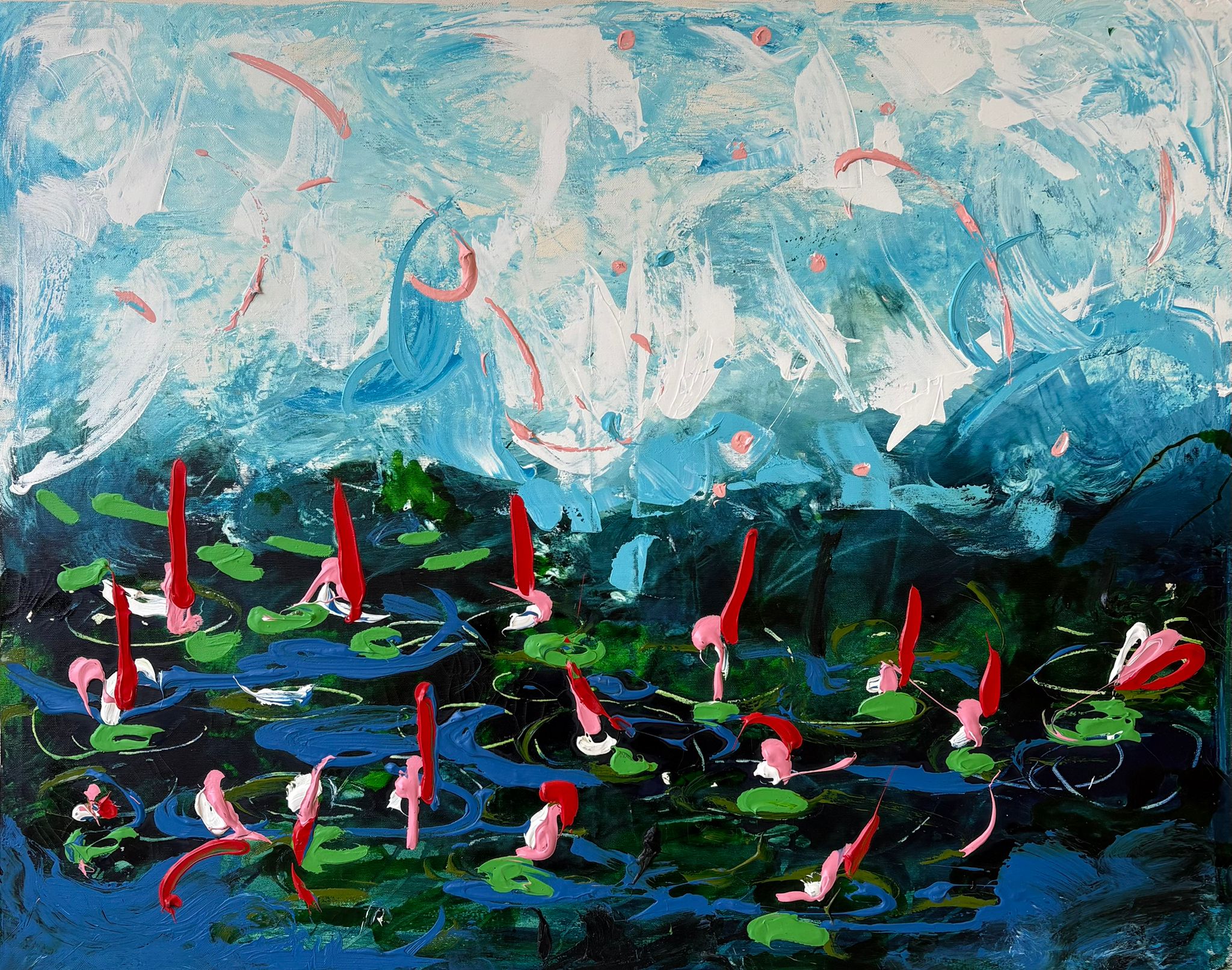 Schifano, maestro indiscusso della sperimentazione nel suo tempo, non si limita a stendere il colore: lo lascia scorrere, lo incastra, lo stratifica fino a renderlo materia. Poi lo guarda espandersi, trasformarsi e respirare, costruendo paesaggi interiori, territori di pura evocazione: la casa, la palma, i gigli d’acqua. La sua ricerca si muove ben oltre la forma, toccando la dimensione sensoriale dell’immagine, dove il gesto pittorico si fonde con la luminosità intrinseca dei materiali.