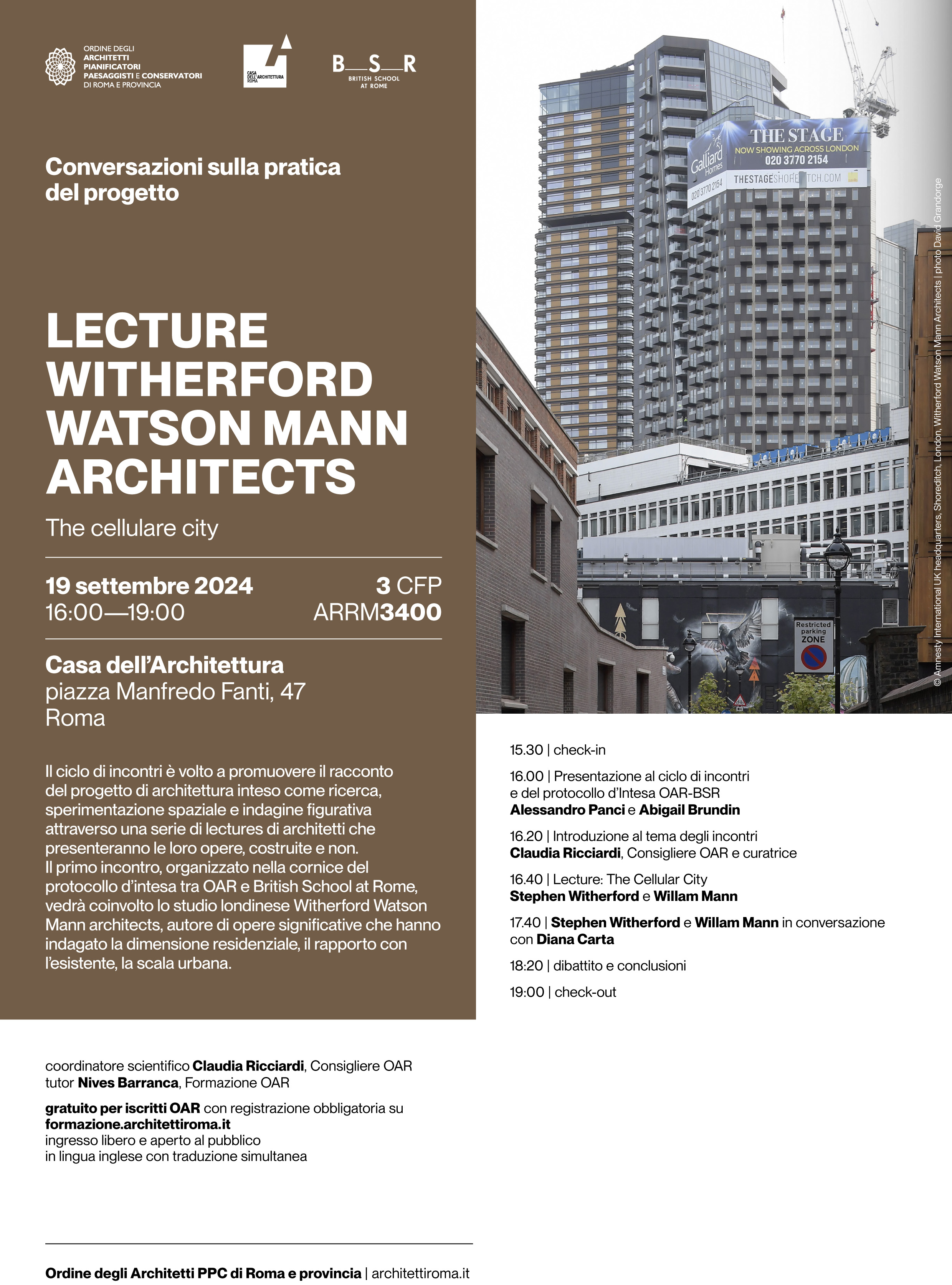 L’incontro è organizzato nella cornice del protocollo d’intesa siglato lo scorso febbraio dal presidente dell’OAR, Alessandro Panci e dalla direttrice della British School at Rome, Abigal Brundin, che prevede un accordo di collaborazione tra i due enti e ha come obiettivo principale la cooperazione in aree di comune interesse, puntando l’attenzione sulla funzione etica, sociale e civile dell’architettura.
