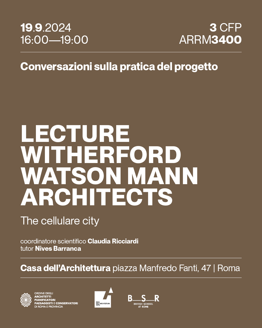 L’incontro sarà aperto dagli interventi di Alessandro Panci e Abigail Brundin che presenteranno il ciclo di incontri. L’introduzione ai temi che saranno discussi è affidata a Claudia Ricciardi, consigliera dell’OAR e coordinatrice scientifica del ciclo di appuntamenti. Al termine della lecture Stephen Witherford e William Mann dialogheranno con Diana Carta, architetto e autrice.