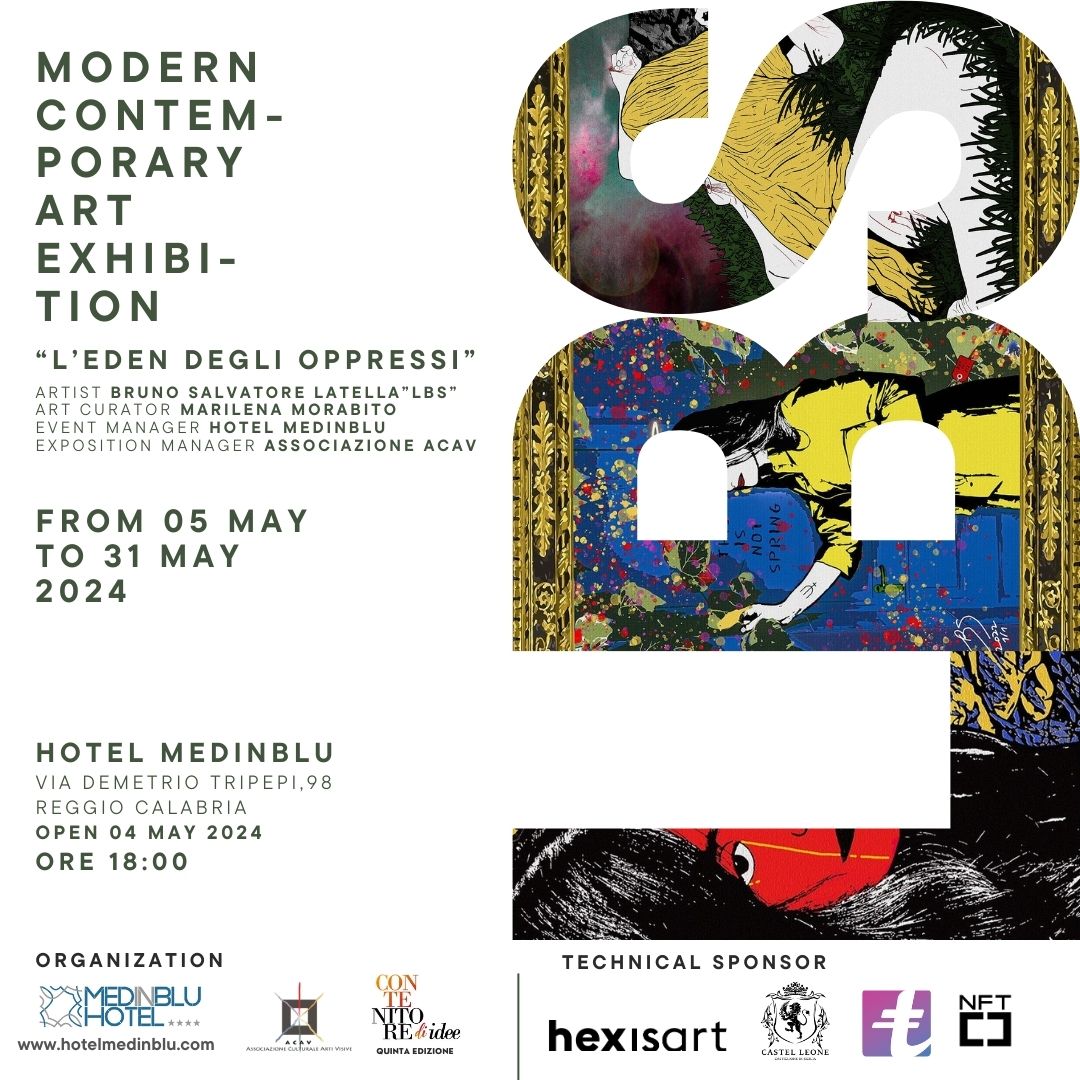 Il progetto espositivo, l’Eden degli Oppressi”, curato da Marilena Morabito ed organizzato dall'associazione ACAV, è stato possibile grazie al sostegno e alla concessione degli spazi ed alla promozione e supporto dell'Hotel Medinblu e del suo direttore Sergio Pitasi sarà visitabile per l'intero mese di maggio 2024. Il progetto espositivo presenta un'installazione site-specific, progettata appositamente per gli ambienti dell'hotel, dando la possibilità all’artista, non solo di creare un’opera d'arte, ma di concepirla in stretta relazione con lo spazio in cui viene esposta, aggiungendo quindi un elemento di interazione tra l'opera e l'ambiente circostante.
