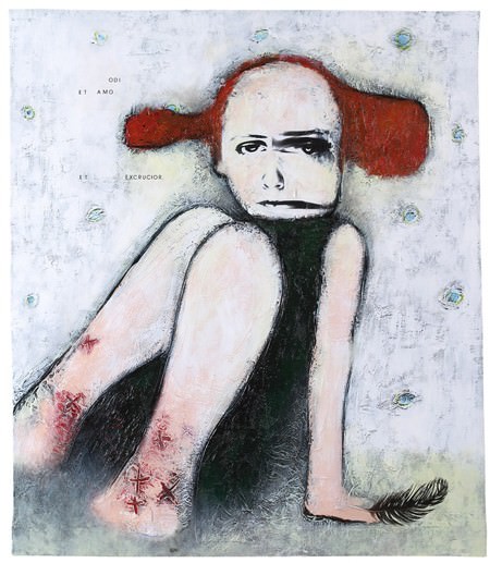 illustrazioni che compone utilizzando di preferenza acrilici, stucchi e