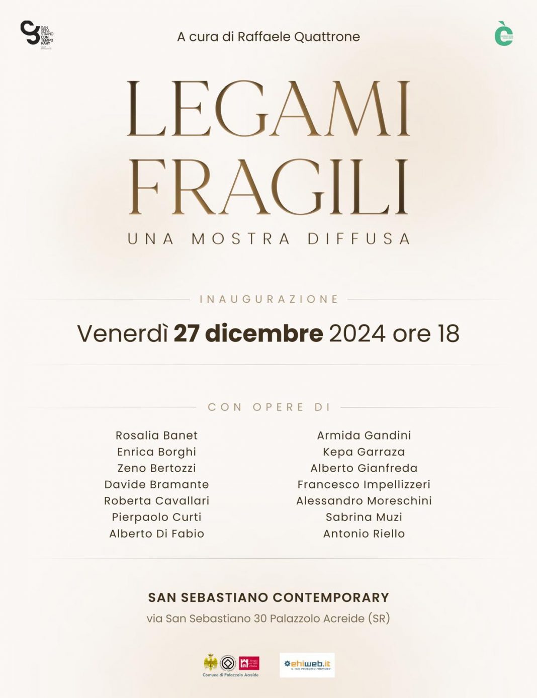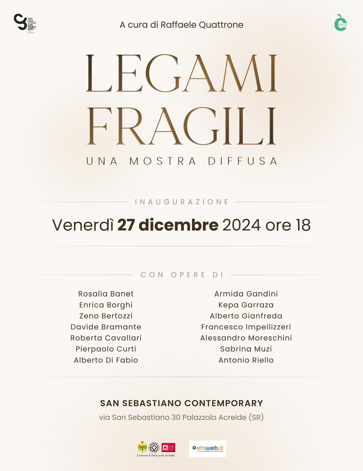 In occasione del quinto anniversario di San Sebastiano Contemporary, Venerdì 27 dicembre alle ore 18 si inaugura a Palazzolo Acreide l’ultima tappa della mostra Legami fragili a cura di Raffaele Quattrone