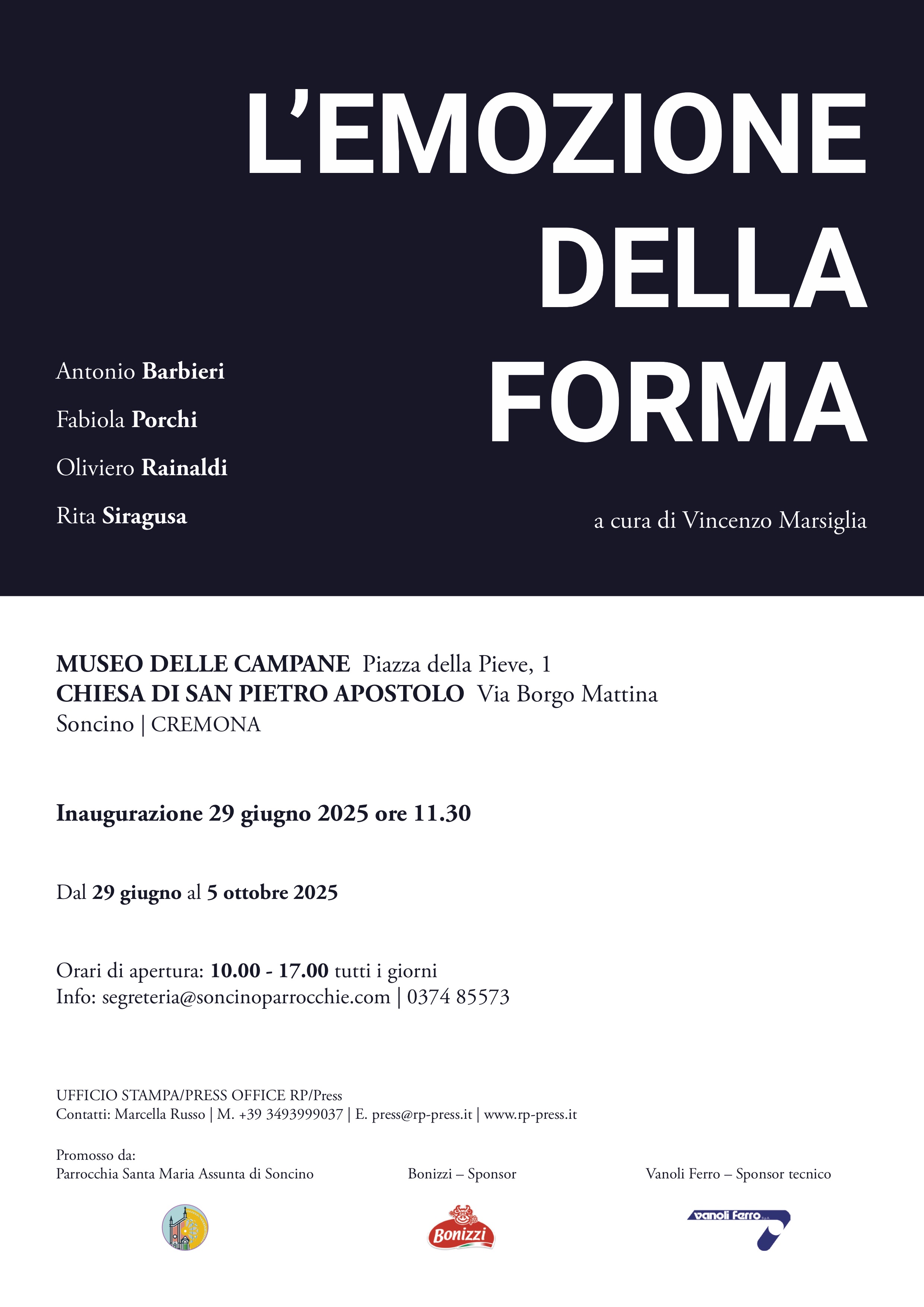 Dal 29 giugno al 5 ottobre 2025, il borgo di Soncino accoglie L’emozione della forma, un progetto di arte contemporanea ideato su proposta di Don Giuseppe Nevi, parroco della comunità, e curato dall’artista Vincenzo Marsiglia. Il progetto, promosso da Parrocchia Santa Maria assunta di Soncino, nasce dal desiderio di restituire nuova vita e centralità ai luoghi sacri del borgo attraverso il linguaggio universale dell’arte, invitando a un’esperienza intima, spirituale e percettiva.