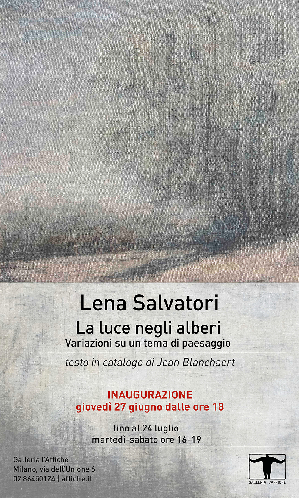 pioppi bianchi vicino ai quali non scorre il Nilo, ma un altro fiume d’Europa. Non fa mai caldo nelle ombre dei suoi quadri, Lena Salvatori è una pittrice del nord e come Aki Kaurismäki è una poetessa dei crepuscoli.» (dal testo in catalogo di Jean Blanchaert)