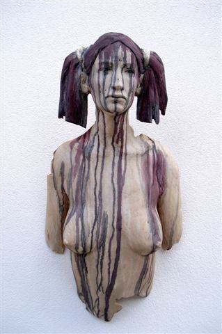 Il lavoro dello scultore altoatesino Leo Demetz prende origine dalle tradizioni della sua terra, conosciuta in tutto il mondo per la lavorazione del legno. L’attenzione per la figura umana è senza dubbio alla base del suo percorso creativo, anche se Demetz non è interessato né alla sua rappresentazione in nome di un ideale estetico, né tantomeno di una riproduzione il più possible fedele alla realtà. Quelli che mette in scena sono dei personaggi, caratterizzati dall’azione compiuta, come i nuotatori o dal loro aspetto fisico, come la donna gatto. Lo scultore gioca con i loro volti e con i loro corpi deformandoli in giochi di linee, sporgenze e rientranze che sembrano amplificare ancor più le emozioni che traspaiono dai loro visi. Alcuni sono solo dei mezzi busti da appendere al muro come dei trofei, esemplificazioni di uomini comuni, spesso annoiati ed abbattuti dalla vita quotidiana o figure affascinanti come l’Essenza che sembra quasi la rappresentazione di una figura divina, un angelo, distaccato ed elegante, la cui presenza contrasta ancora di più con le ultime due figure, un uomo ed una donna dalla vernice che cola indisturbata sui loro volti. Forse dei diavoli o degli essere crudeli, che completano questo circolo di presenze di varia umanità, dalla terra al cielo.