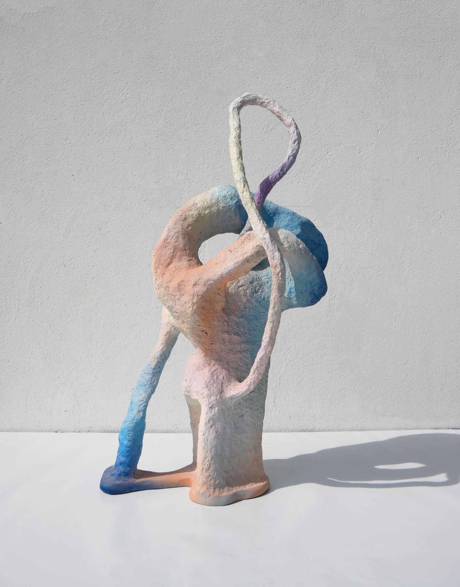 Consapevole dell'urgenza di tutelare la biodiversità e rispettare la Terra, Orta si esprime magistralmente mediante la scelta riflessiva dei materiali e dell'energia che essi stessi sprigionano, tracciando le fasi peculiari dei processi di ibridazione tra l'umano, l'animale e il vegetale. Prendendo ispirazione dagli scritti del biologo e filosofo tedesco Andreas Weber – generalmente incentrati sulla crisi ambientale, sul rapporto dell’uomo con la natura, sulla necessità di un'economia al servizio del pianeta e dell’uomo, sul ruolo della scienza e così via – Orta denuncia questa nostra società inebriata dalle industrie produttive in favore di una necessaria e ormai improrogabile riconciliazione con la Terra. Attraverso una pratica scultorea che fonde con sapienza arte e design, Leo Orta ci invita a riflettere sull’interconnessione tra individuo e comunità, esplorando le dimensioni sociali e psicologiche dell’esistenza umana. Per di più, ispirato dagli insegnamenti dell’esistenzialismo di Martin Heidegger, Jean-Paul Sartre e Maurice Merleau-Ponty, in particolare dal concetto di "essere-nel-mondo" (Dasein) di Heidegger, Orta traduce queste idee nelle sue sculture, generando manifestazioni tangibili della delicata interazione tra l’individuo e l’ambiente. Le sue opere, dal carattere esplorativo, creano mondi concreti e al contempo astratti, evocando sensazioni profonde legate al corpo, alla memoria e alla trasformazione. Ogni scultura diventa uno spazio di riflessione sulla vulnerabilità dell’uomo e sulla sua incessante ricerca di significato, dove le forme si intrecciano ed evolvono, si contraggono e si dilatano, sollecitando un'esperienza degli eventi più intima, sensibile e profondamente emotiva. Orta trae ispirazione anche da altre fonti, tra cui la psicoanalisi, con l’intento di connettersi al subconscio e all’immaginario, al fine di esprimere i sentimenti in modo più spontaneo attraverso le sue opere. Fa riferimento alle metafore di Henry Moore, che definiva la sua arte monumentale come “un'espressione del significato della vita e un'esortazione a impegnarsi nella vita”, e alle manifestazioni emotive e sofisticate di Niki de Saint Phalle. Recentemente, si è concentrato sul lavoro conturbante di David Altmejd, apprezzando la sua relazione intuitiva con la forma e i cambiamenti di stato provocati dai materiali, esplorandone il potenziale espressivo. Oltre a tutto ciò, è anche affascinato dal mondo industriale e delle fabbriche, da cui trae spunti per comprendere i cicli di produzione, dalla creazione all'uso finale, esplorando pratiche di riciclo e riutilizzo come alternative alla distruzione inesorabile. Infine, si ispira alla magnificenza della natura, alla sua estetica organica, alla bellezza rigogliosa della biodiversità che la caratterizza e alla sua scomparsa, tanto rapida quanto graduale e devastante. Alla luce di tutto ciò, in un clima esiziale, che sembra minacciare l'equilibrio stesso della vita, e sempre più instabile, le sue sculture — quasi presenze lunari stilizzate — si manifestano attraverso una matericità densa e corposa, con variazioni cromatiche che spaziano dalle tonalità di una terra particolarmente assetata a quelle del cielo, talvolta terso, talaltra — come in questo caso — attraversato da bagliori boreali. Ne scaturisce una tensione profonda tra permanenza e dissoluzione, tra erosione e rinnovamento.