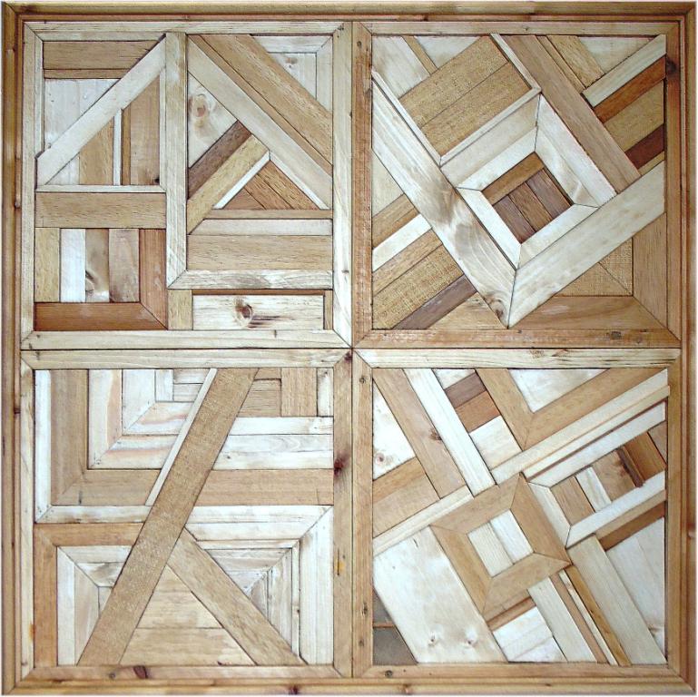 che sta alla base dell'originale lavoro dell'artista : spezzoni di essenze dalle diverse forme geometriche e differenti cromatismi che vanno, assiemandosi, ad intraprendere un 'nuovo percorso di vita', elevandosi ad opera d’arte.