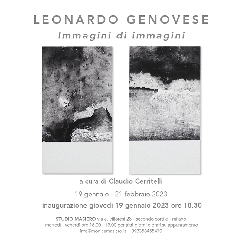 La galleria Studio Masiero è lieta di ospitare la personale Immagini di immagini, di Leonardo Genovese a cura di Claudio Cerritelli. Artista visuale da sempre impegnato con diversi mezzi espressivi, propone la sua ultima ricerca fra fotografia e pittura: una serie di lavori inediti, in bianco e nero, con qualche magnetica digressione al colore.