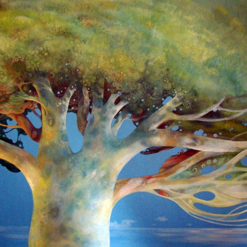 Le opere di Leone Lasio hanno qualcosa di magico che le avvicina alle illustrazioni delle fiabe russe di Puskin o alle immagini di Nicola Pankoff. Sono viaggi onirici impreziositi da richiami geometrico / ornamentali, come un quadro di Klimt, e nel gusto compositivo si riscontrano alcune analogie con lo stile simbolista, a loro volta riprese dalle stampe giapponesi. Come un buon libro fantasy non si riesce a distinguere il reale target cui è destinato questo lavoro e, l’impressione è rafforzata dai colori pastello delle scene. È un modo personale di vedere la Natura. L’albero è un elemento predominante come simbolo di unione tra Cielo e Terra, ecco le due fonti d’ispirazione primarie: il cielo, con le sue nuvole in movimento, e la terra, con le cascate, le acque e la vegetazione. E poi gli uccelli, indiscutibile sinonimo di libertà (“Free as a bird” cantavano i Beatles) ma anche di fantasia; e la fantasia di certo non manca al nostro artista, nel senso più nobile del termine, quella fantasia che ti permette di immaginare mondi e di riprodurli a beneficio del pubblico. Tutto dà l’idea di trasparenza e innocenza. Vengono in mente le atmosfere romantiche tipiche della letteratura fiabesca e, sembra di trovarsi in una dimensione sospesa in attesa che si materializzi una presenza magica. Ma c’è qualcosa di più: la volontà di una rappresentazione cosmica, testimoniata dalle piante ma anche dall’incontro con il divino, come in un grande mural su scala ridotta. La raffigurazione umana si limita a pochi casi, sempre attenti a un’impostazione classica, formale del lavoro, a sottolineare la compenetrazione univoca tra individuo e ambiente. La raffinatezza è data dalla scelta delle tinte che gioca con il paesaggio celando e rivelando alcuni particolari. (Testo critico a cura di Elena Colombo)