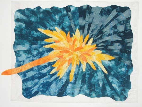 La stoffa, materiale estremamente duttile e materico, diventa il linguaggio che le permette di comunicare e di esprimersi. La paura istintiva della tela bianca e’ superata tagliando la stessa e rimontandola secondo geometrie e schemi ripresi dalla memoria, dalla natura stessa o dal profondo della fantasia, a volte in maniera astratta, altri più realistica. La stessa stoffa, di forte impatto cromatico, è tinta e manipolata con procedimenti quasi da alchimista, utilizzando anche piante e foglie.